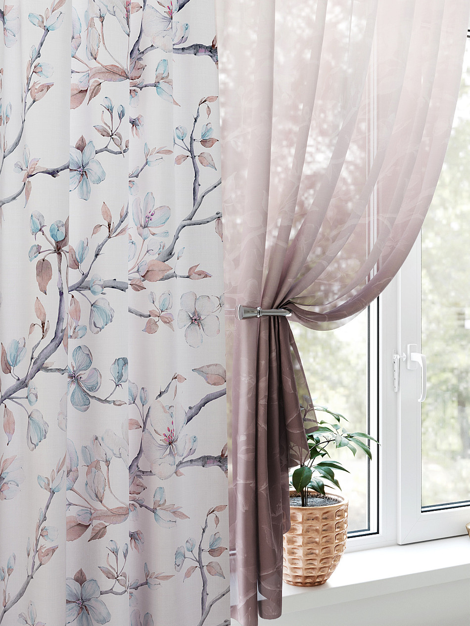 Тюль 2 шт.: Легкая основа (вуаль) оформлена флористическим рисунком. Ширина — 150 см., высота — 180 см., крепление — шторная лента (крючки).