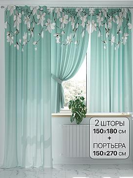 Портьеры 2 шт.: Легкая основа оформлена флористическим рисунком. Ширина — 150 см, высота — 180 см, крепление — шторная лента (крючки).