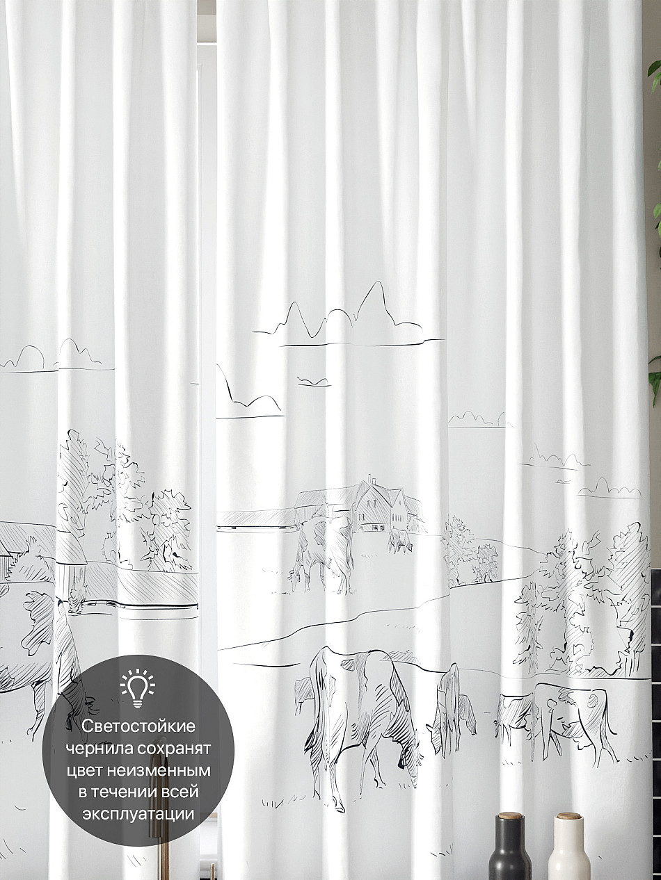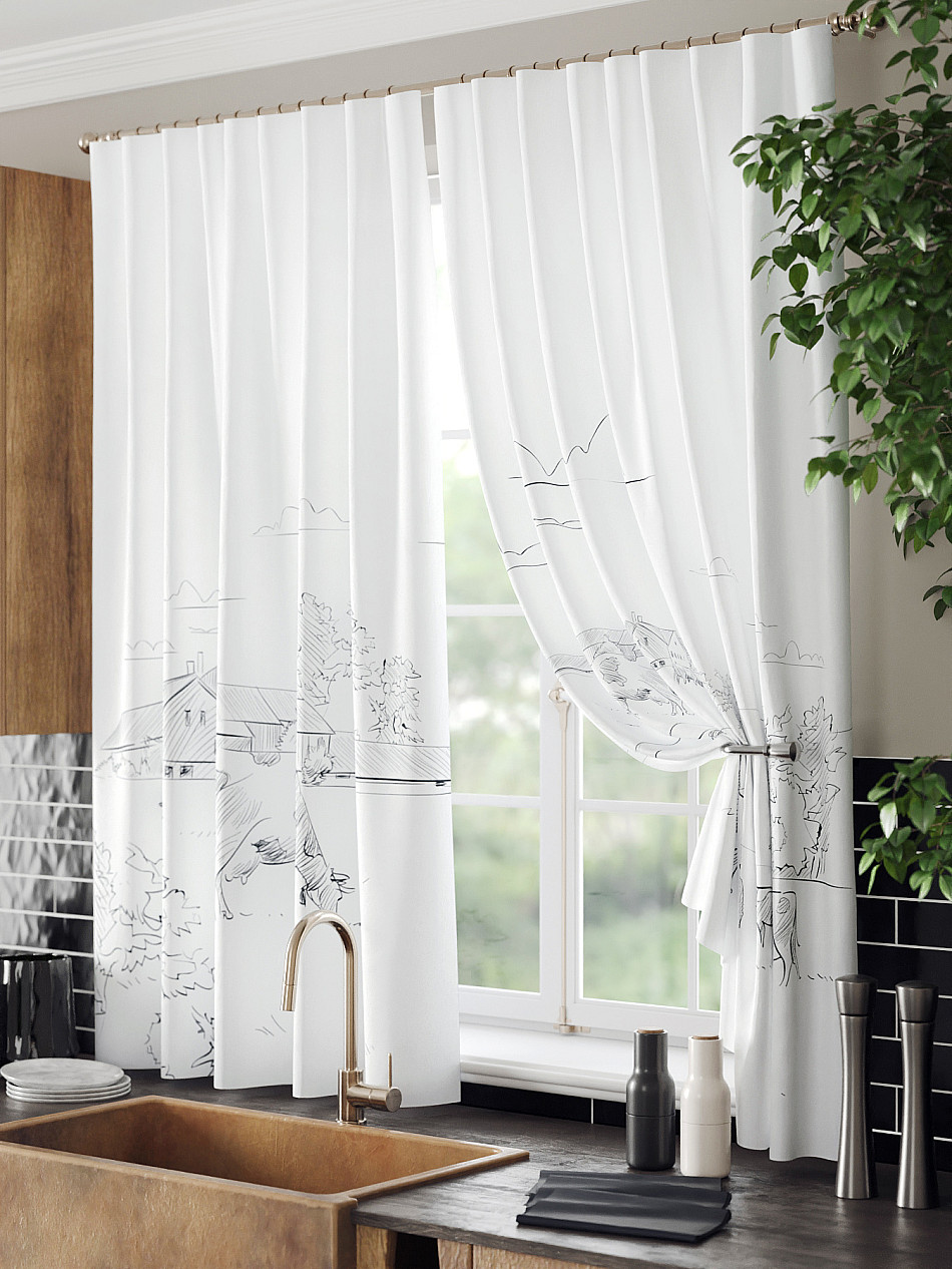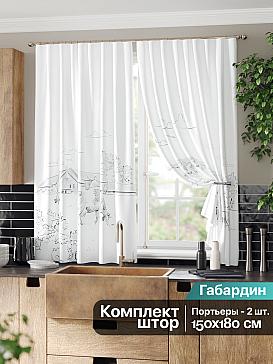 Комплект штор из легкой портьерной ткани (габардин) оформлен печатным рисунком. Печатный рисунок дает широкие возможности обновить интерьер фактически нет требуя ремонта за счет огромного выбора. Ткани с печатным рисунком безопасны и не содержат токсичных веществ. Не смотря на то что, материал легкий, он имеет высокую плотность, мало загрязнятся и не требует особого ухода даже после стирки, что важно для кухонных занавесок. Шторы не выцветают, не растягиваются, превосходно драпируются, образуя струящиеся складки. Прекрасное решение для создания красоты и уюта с помощью уникальных дизайнов.