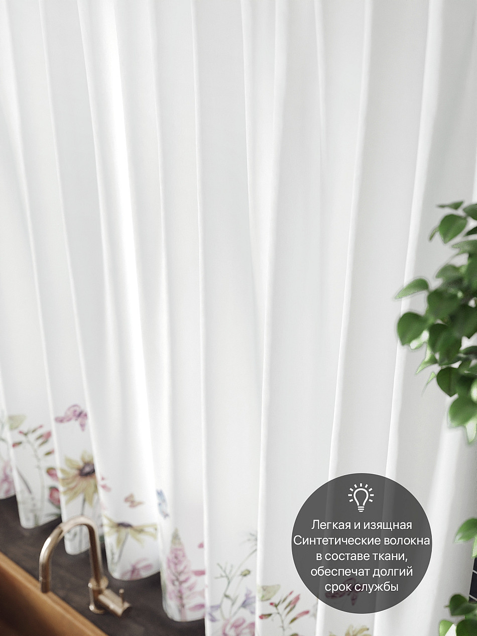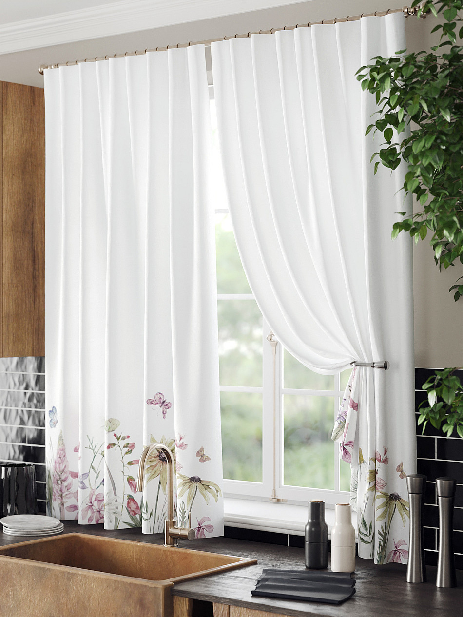 Комплект штор из легкой портьерной ткани (габардин) оформлен печатным рисунком. Печатный рисунок дает широкие возможности обновить интерьер фактически нет требуя ремонта за счет огромного выбора. Ткани с печатным рисунком безопасны и не содержат токсичных веществ. Не смотря на то что, материал легкий, он имеет высокую плотность, мало загрязнятся и не требует особого ухода даже после стирки, что важно для кухонных занавесок. Шторы не выцветают, не растягиваются, превосходно драпируются, образуя струящиеся складки. Прекрасное решение для создания красоты и уюта с помощью уникальных дизайнов.