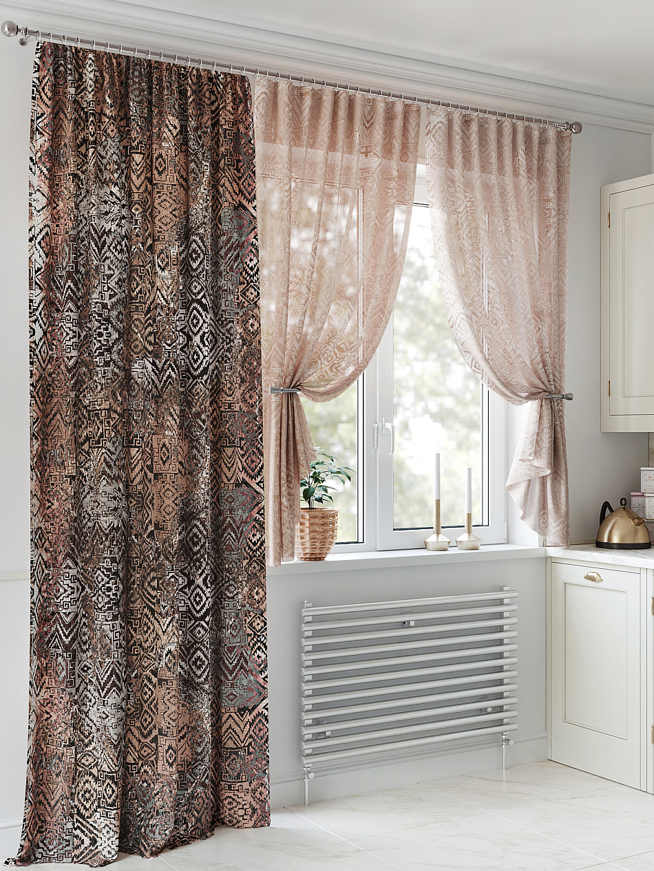 Портьера 150х250 см — 1 шт., вуаль 150х180 см — 2 шт. ( Уменьшить высоту ) Крепление: шторная лента (крючки), кулиска Подробнее