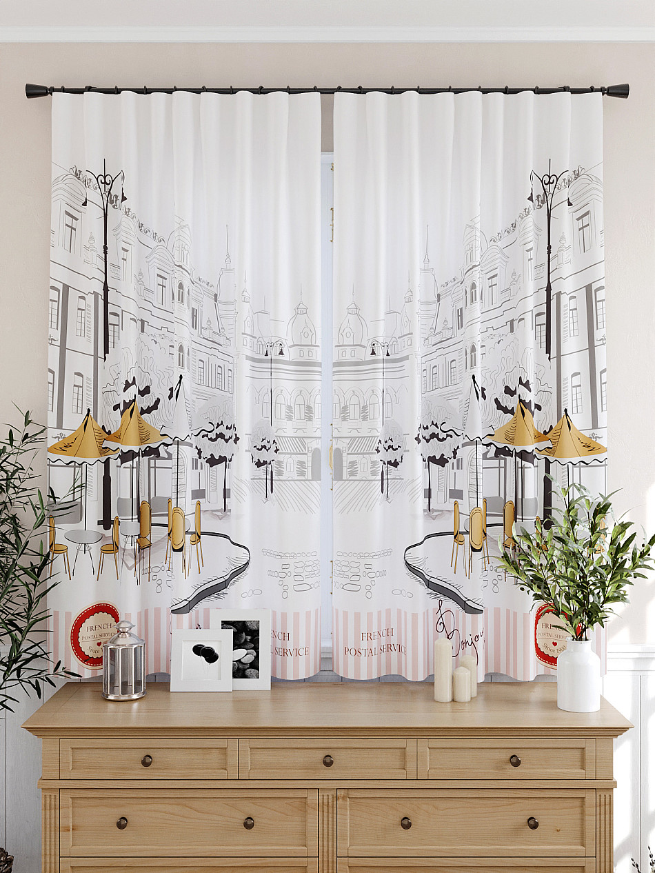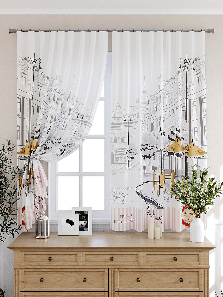 Портьеры 2 шт: Комплект штор из легкой портьерной ткани (габардин) оформлен печатным рисунком. Печатный рисунок дает широкие возможности обновить интерьер фактически нет требуя ремонта за счет огромного выбора. Ткани с печатным рисунком безопасны и не содержат токсичных веществ. Не смотря на то что, материал легкий, он имеет высокую плотность, мало загрязнятся и не требует особого ухода даже после стирки, что важно для кухонных занавесок. Шторы не выцветают, не растягиваются, превосходно драпируются, образуя струящиеся складки. Прекрасное решение для создания красоты и уюта с помощью уникальных дизайнов.