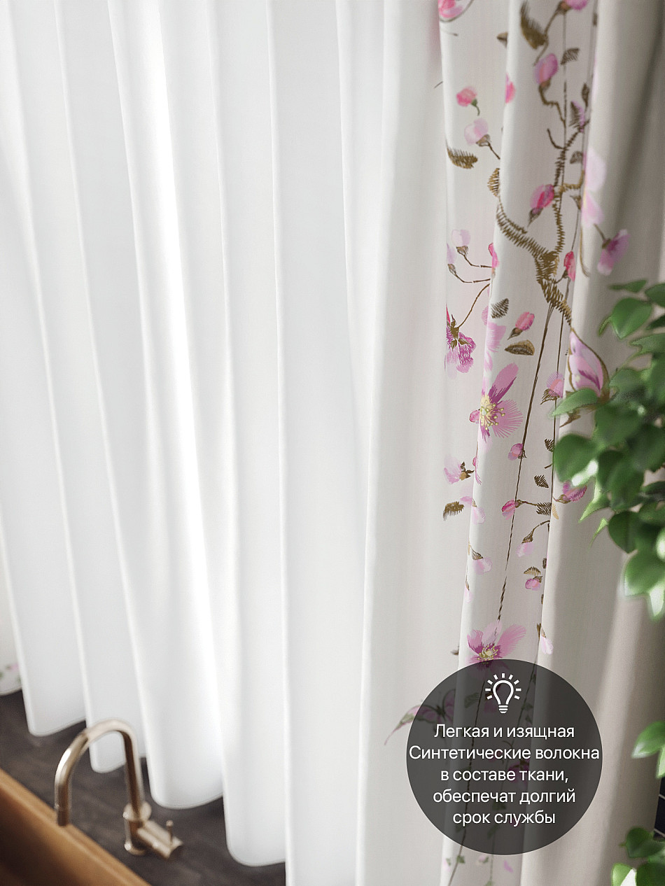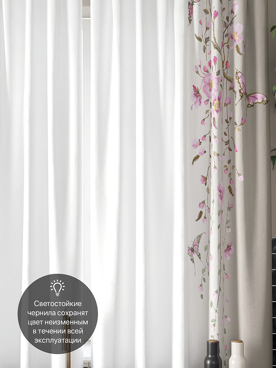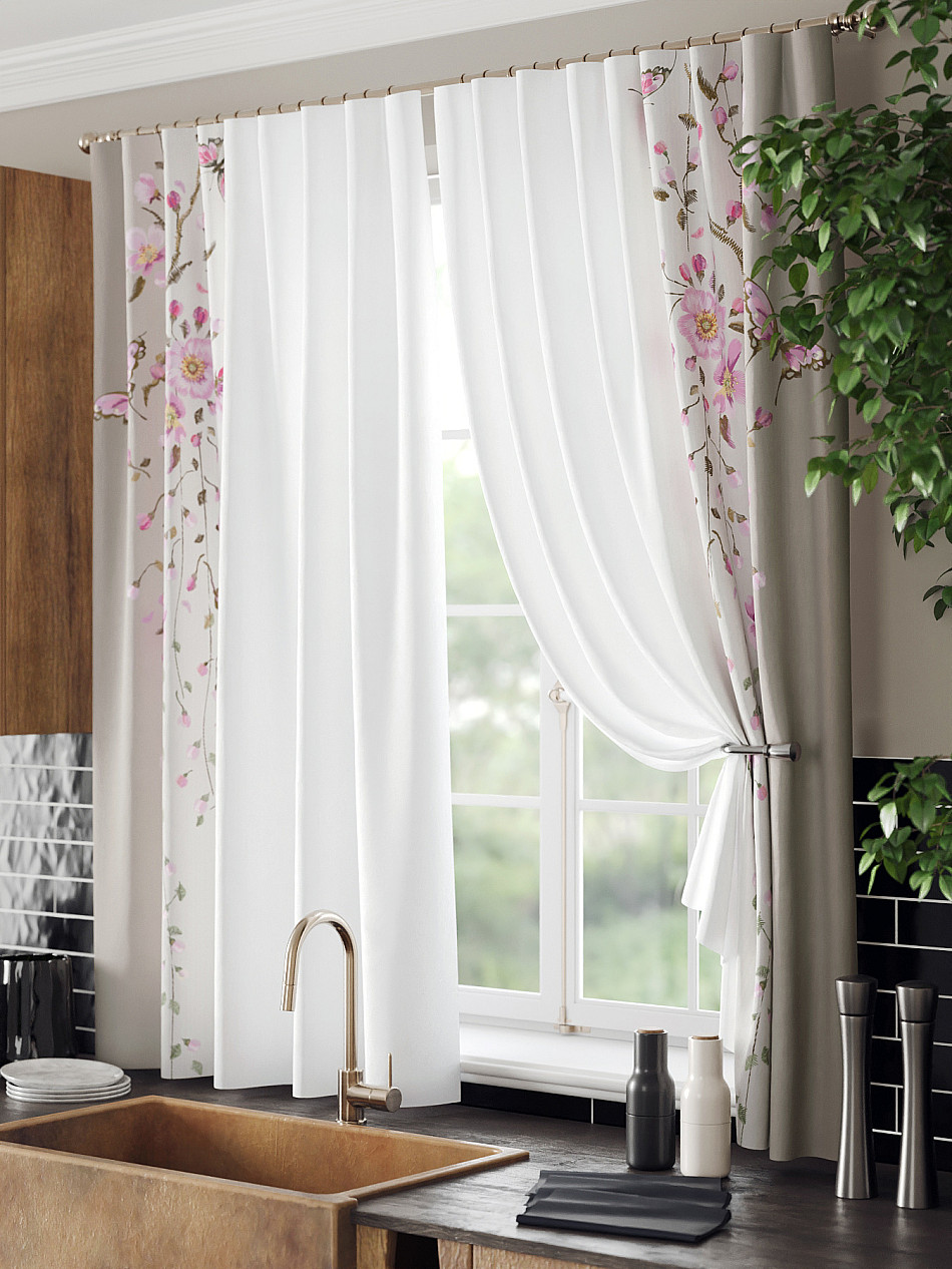 Комплект штор из легкой портьерной ткани (габардин) оформлен печатным рисунком. Печатный рисунок дает широкие возможности обновить интерьер фактически нет требуя ремонта за счет огромного выбора. Ткани с печатным рисунком безопасны и не содержат токсичных веществ. Не смотря на то что, материал легкий, он имеет высокую плотность, мало загрязнятся и не требует особого ухода даже после стирки, что важно для кухонных занавесок. Шторы не выцветают, не растягиваются, превосходно драпируются, образуя струящиеся складки. Прекрасное решение для создания красоты и уюта с помощью уникальных дизайнов.