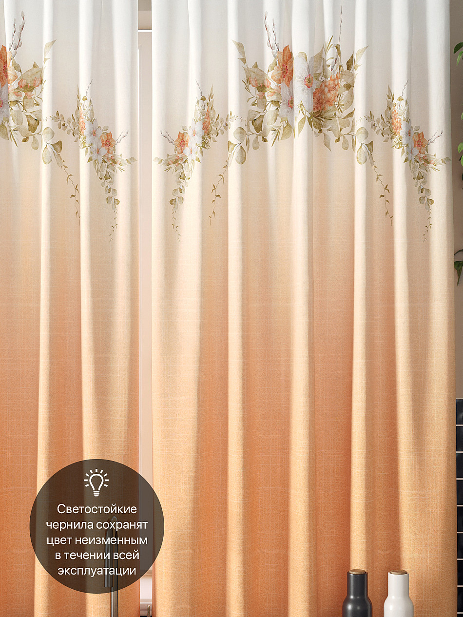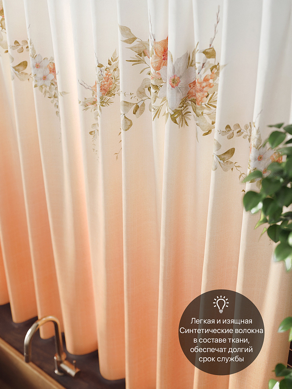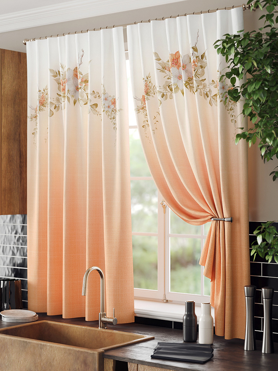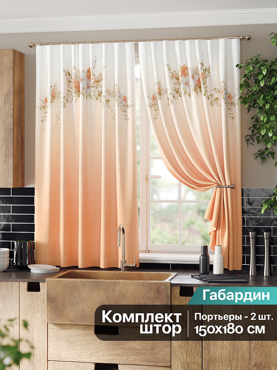 Комплект штор из легкой портьерной ткани (габардин) оформлен печатным рисунком. Печатный рисунок дает широкие возможности обновить интерьер фактически нет требуя ремонта за счет огромного выбора. Ткани с печатным рисунком безопасны и не содержат токсичных веществ. Не смотря на то что, материал легкий, он имеет высокую плотность, мало загрязнятся и не требует особого ухода даже после стирки, что важно для кухонных занавесок. Шторы не выцветают, не растягиваются, превосходно драпируются, образуя струящиеся складки. Прекрасное решение для создания красоты и уюта с помощью уникальных дизайнов.
