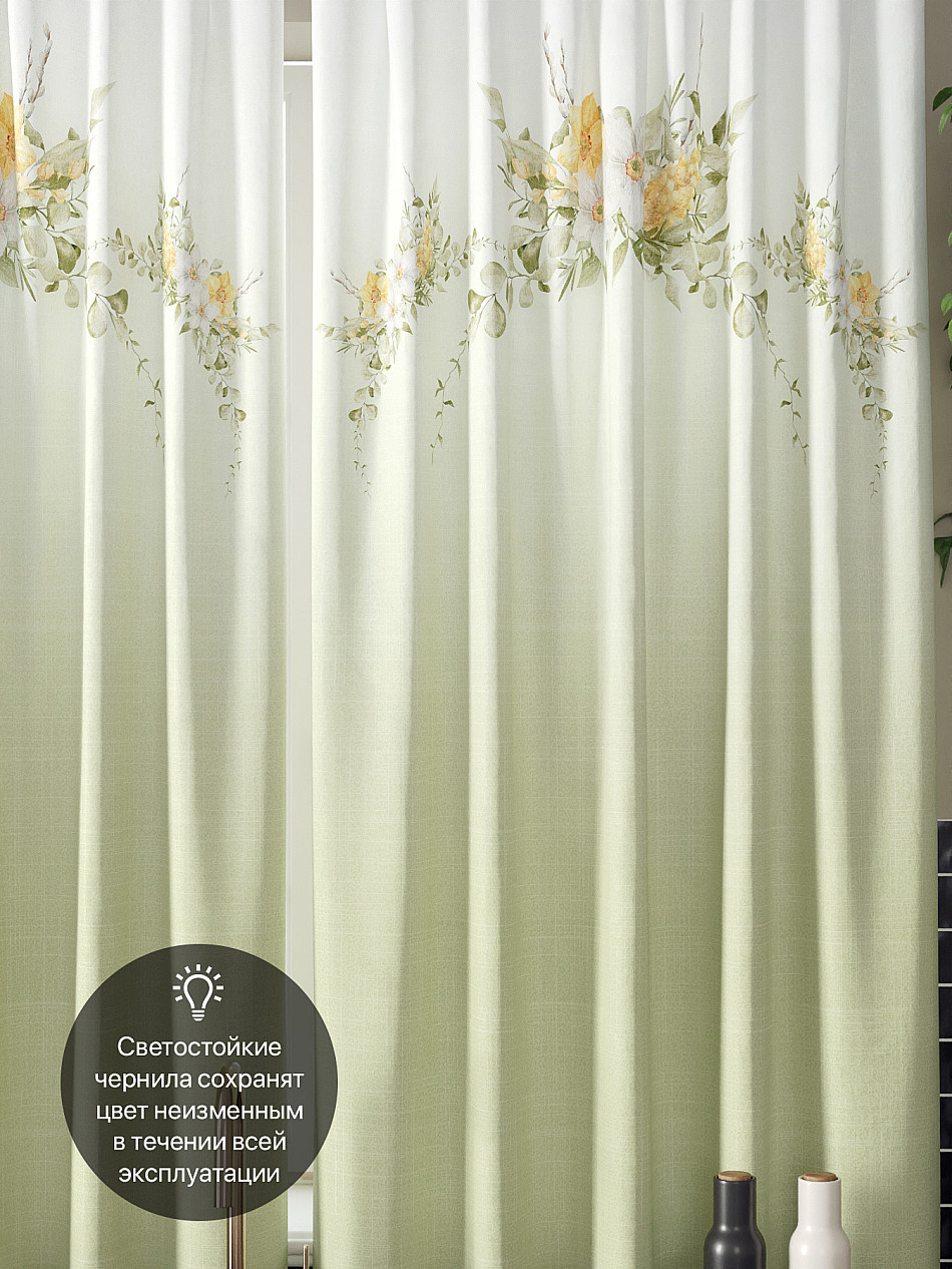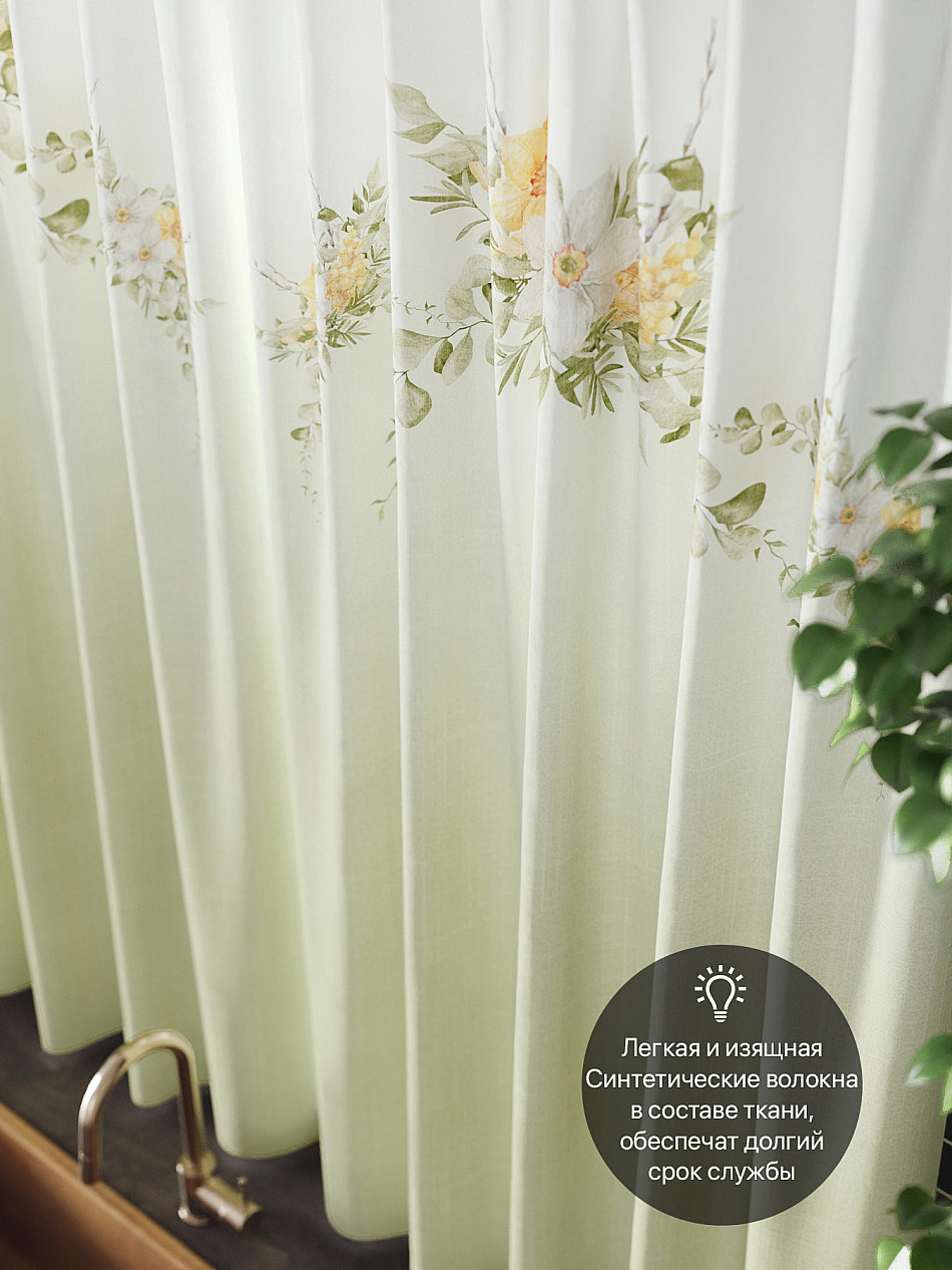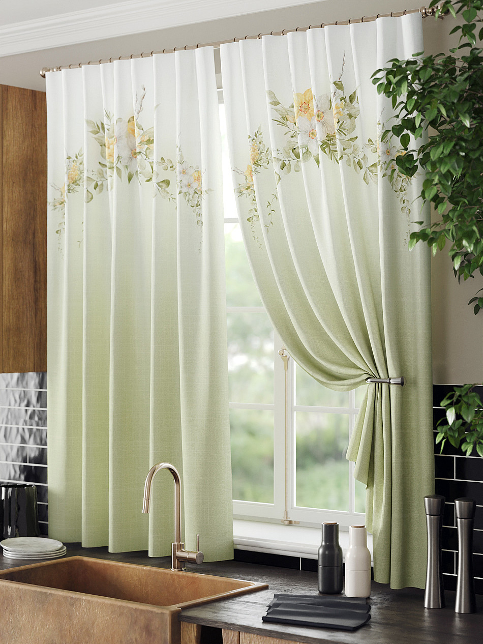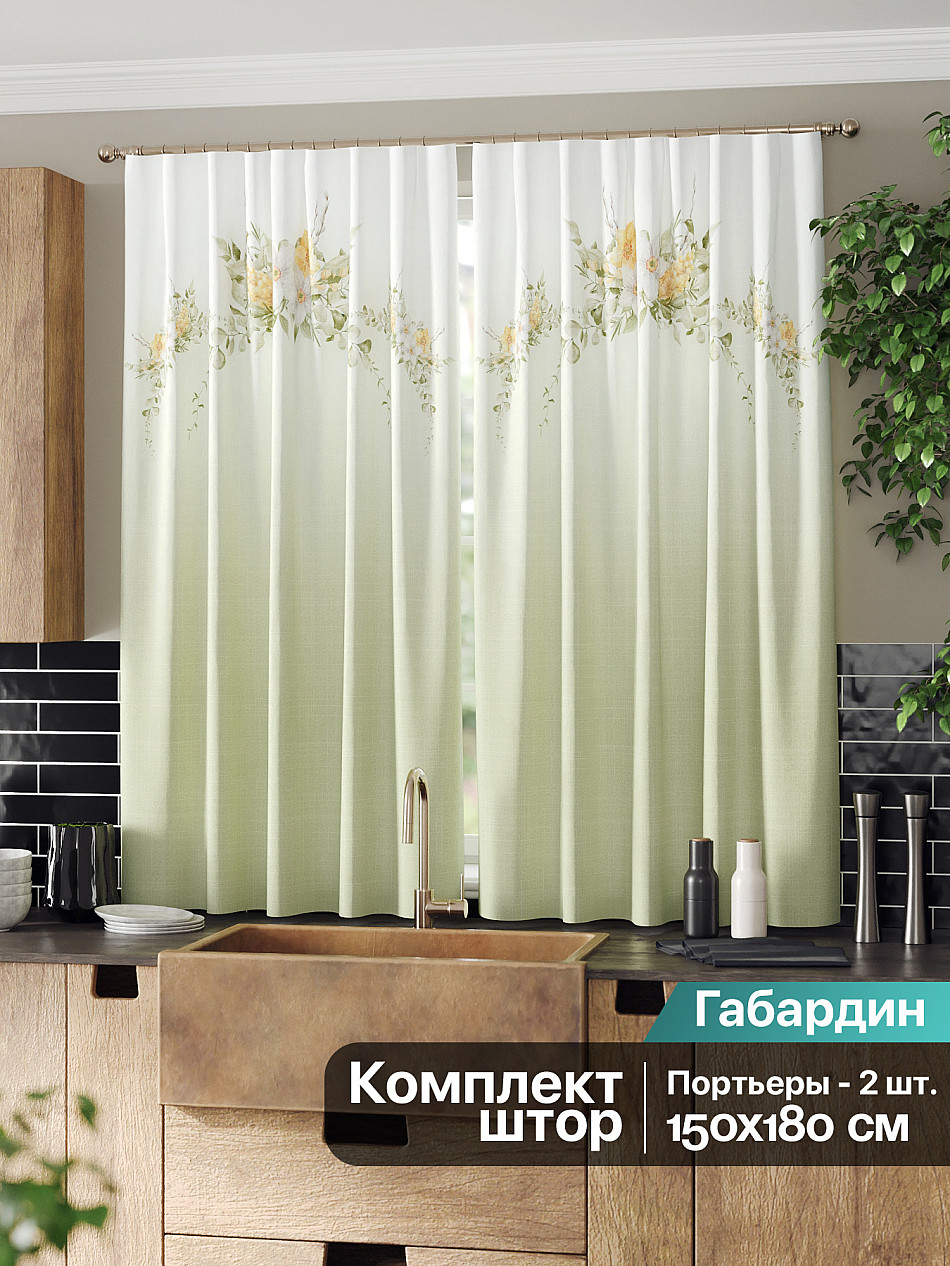 Комплект штор из легкой портьерной ткани (габардин) оформлен печатным рисунком. Печатный рисунок дает широкие возможности обновить интерьер фактически нет требуя ремонта за счет огромного выбора. Ткани с печатным рисунком безопасны и не содержат токсичных веществ. Не смотря на то что, материал легкий, он имеет высокую плотность, мало загрязнятся и не требует особого ухода даже после стирки, что важно для кухонных занавесок. Шторы не выцветают, не растягиваются, превосходно драпируются, образуя струящиеся складки. Прекрасное решение для создания красоты и уюта с помощью уникальных дизайнов.