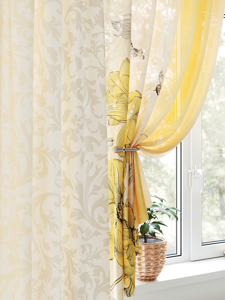 - Состав комплекта Портьера 150х270 см — 1 шт., вуаль 150х180 см — 2 шт.