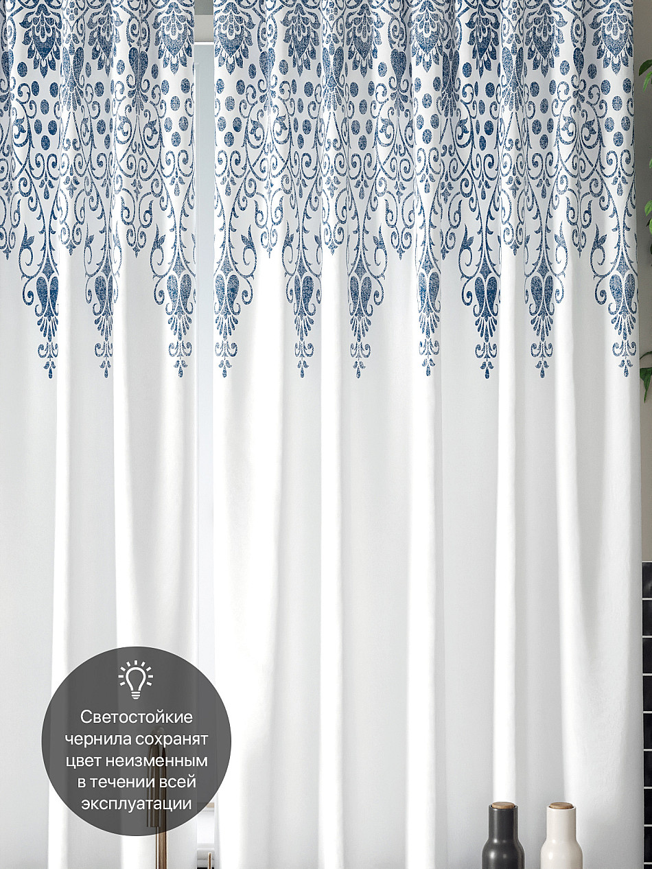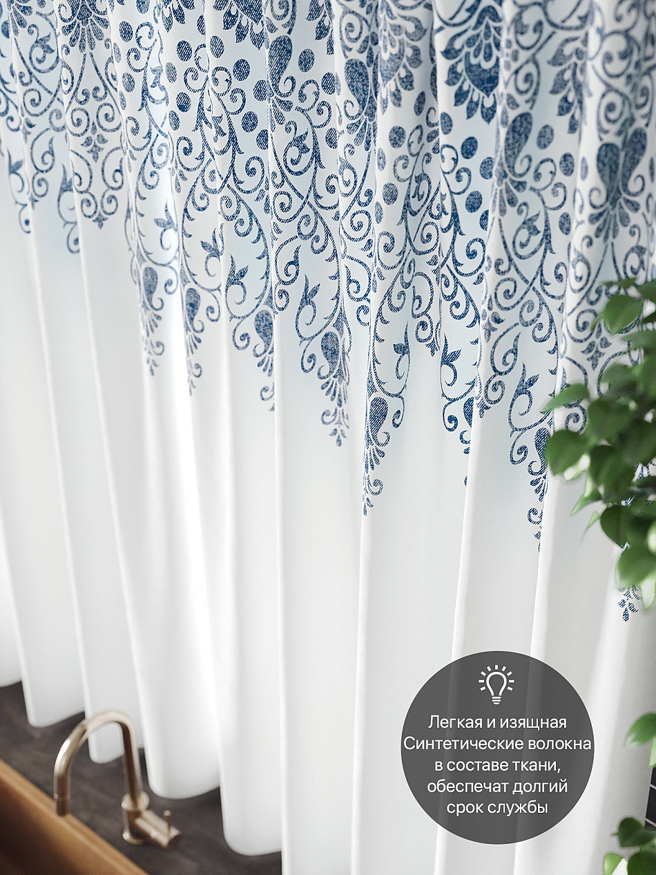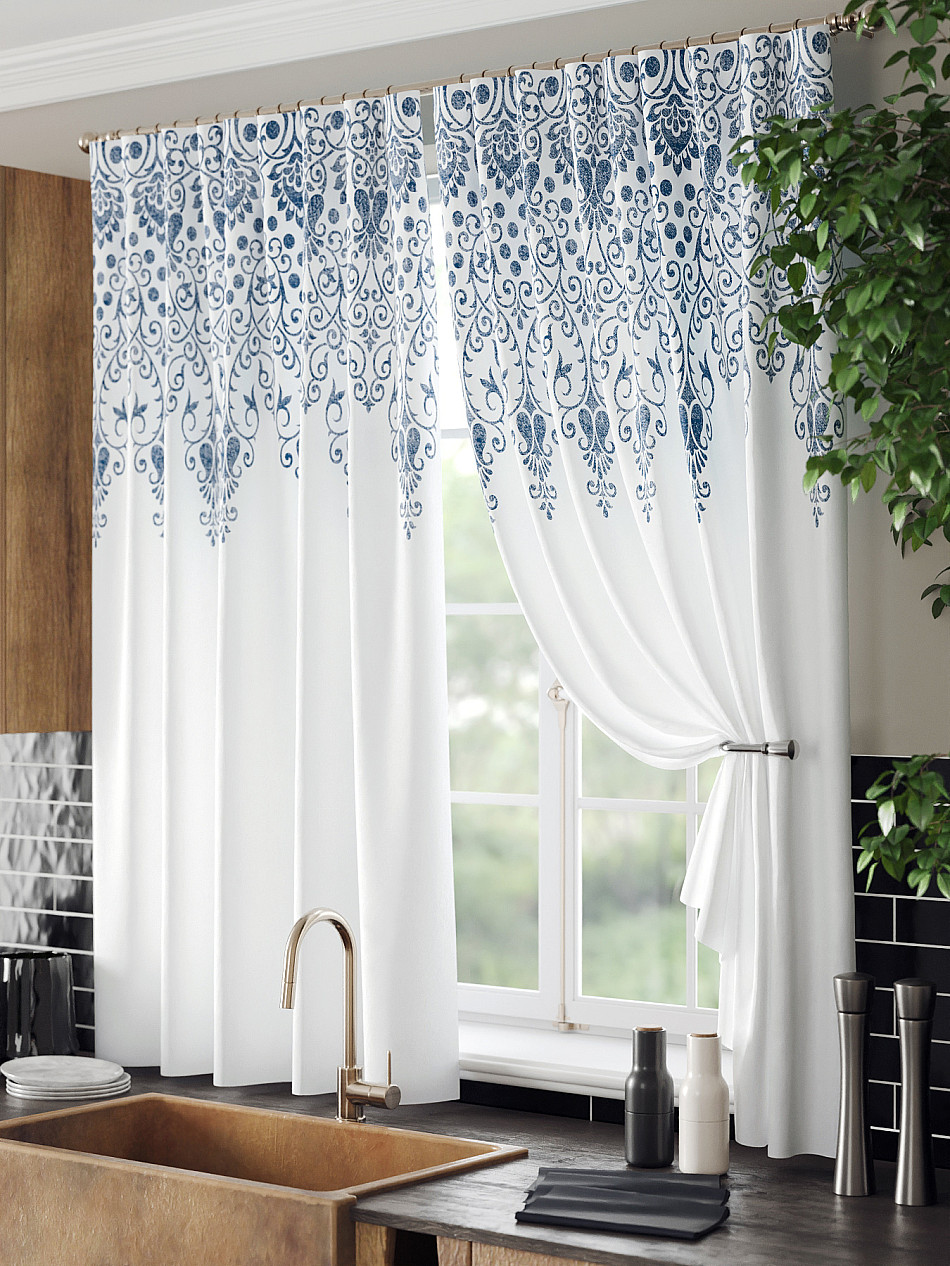 Комплект штор из легкой портьерной ткани (габардин) оформлен печатным рисунком. Печатный рисунок дает широкие возможности обновить интерьер фактически нет требуя ремонта за счет огромного выбора. Ткани с печатным рисунком безопасны и не содержат токсичных веществ. Не смотря на то что, материал легкий, он имеет высокую плотность, мало загрязнятся и не требует особого ухода даже после стирки, что важно для кухонных занавесок. Шторы не выцветают, не растягиваются, превосходно драпируются, образуя струящиеся складки. Прекрасное решение для создания красоты и уюта с помощью уникальных дизайнов.