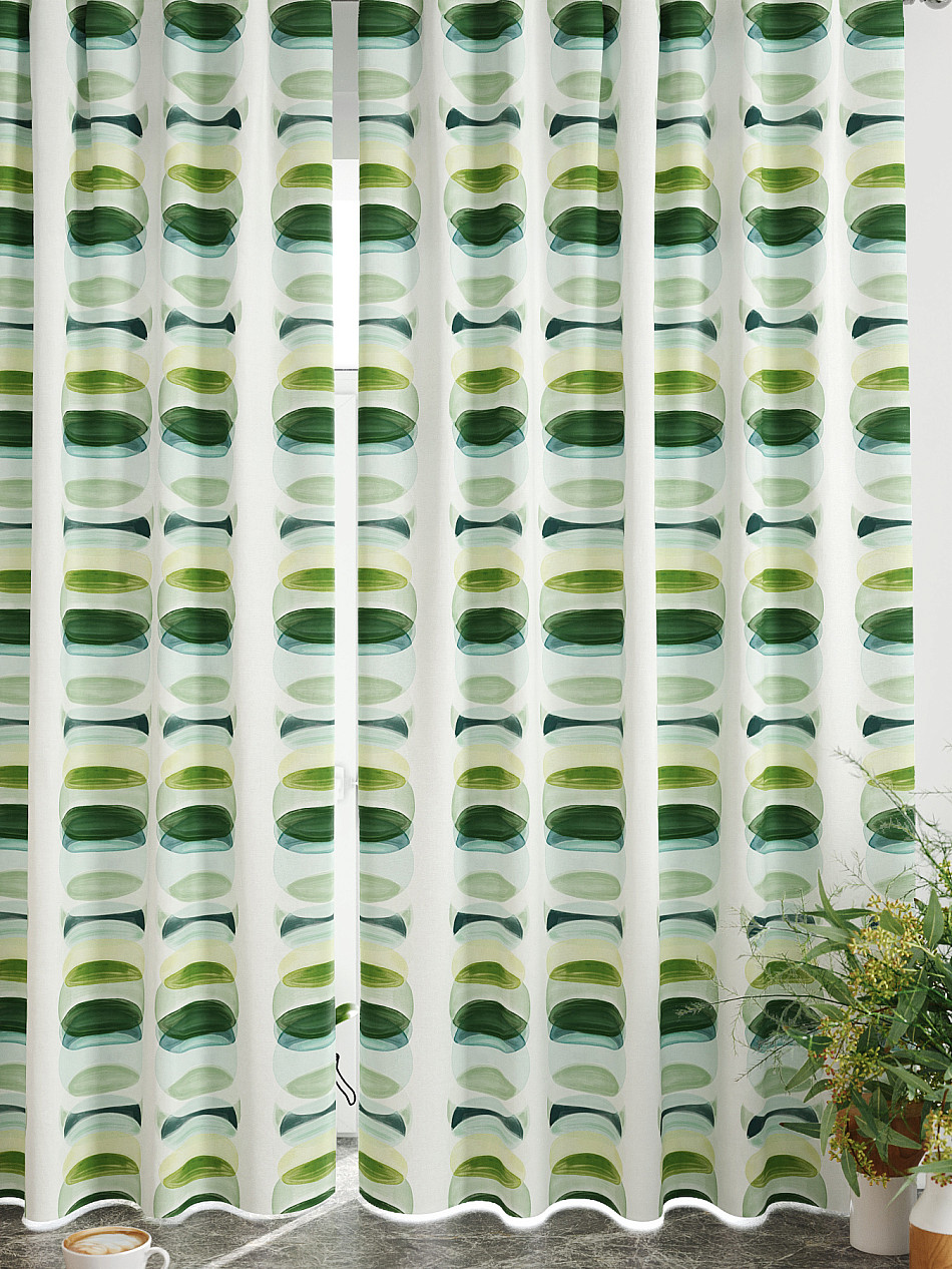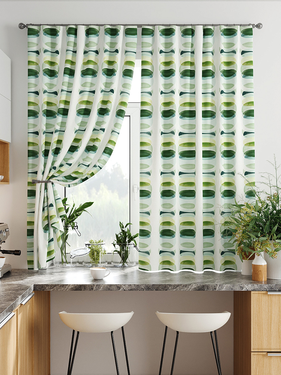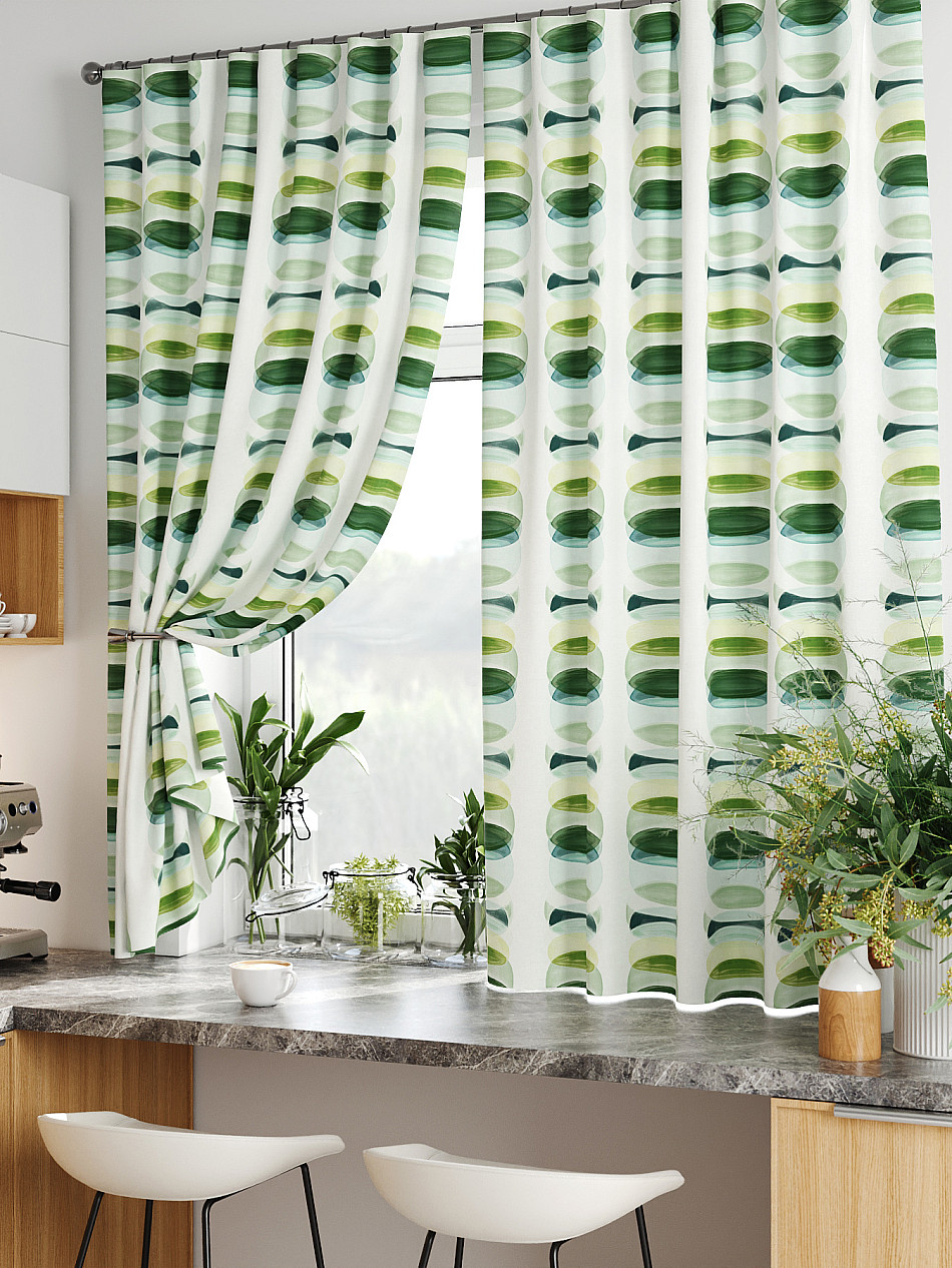 Комплект штор из легкой портьерной ткани (габардин) оформлен печатным рисунком. Печатный рисунок дает широкие возможности обновить интерьер фактически нет требуя ремонта за счет огромного выбора. Ткани с печатным рисунком безопасны и не содержат токсичных веществ. Не смотря на то что, материал легкий, он имеет высокую плотность, мало загрязнятся и не требует особого ухода даже после стирки, что важно для кухонных занавесок. Шторы не выцветают, не растягиваются, превосходно драпируются, образуя струящиеся складки. Прекрасное решение для создания красоты и уюта с помощью уникальных дизайнов.