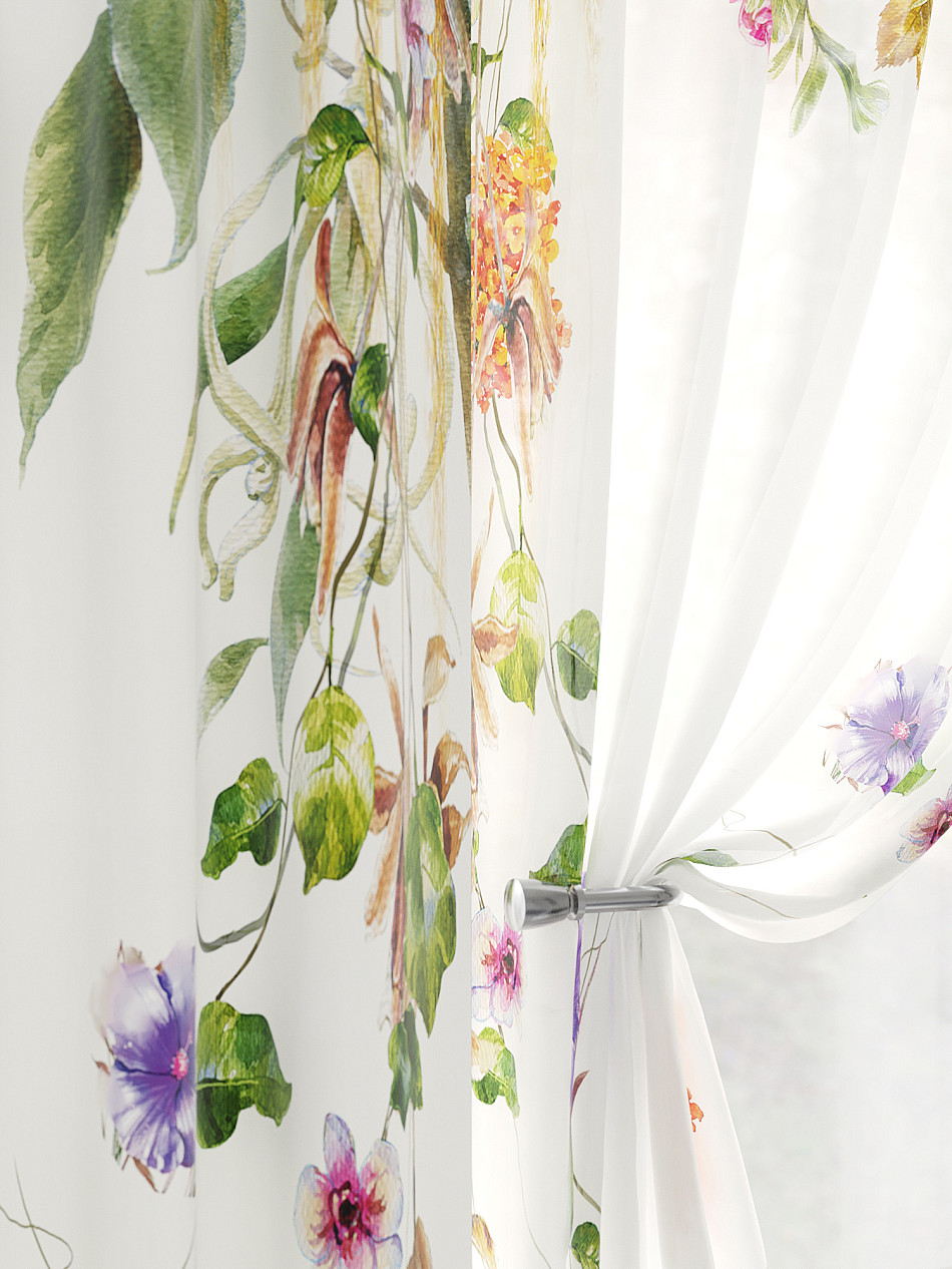 Тюль 2 шт.: Легкая основа (вуаль) оформлена флористическим рисунком. Ширина — 150 см., высота — 180 см., крепление — шторная лента (крючки).