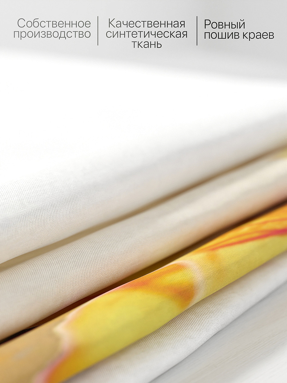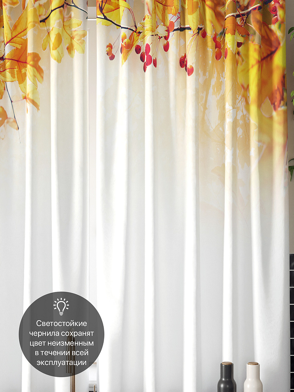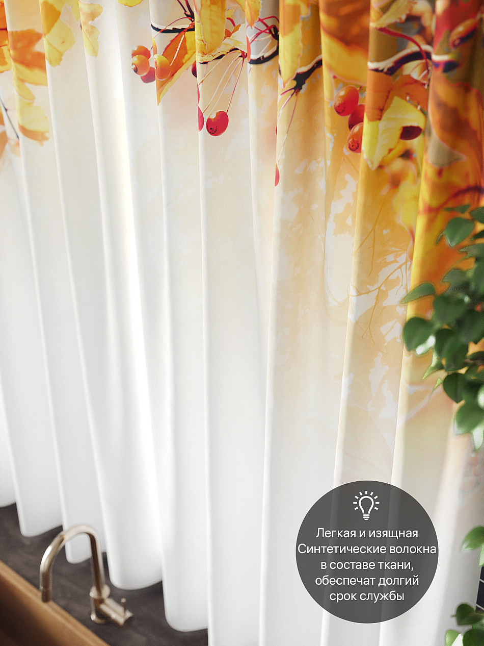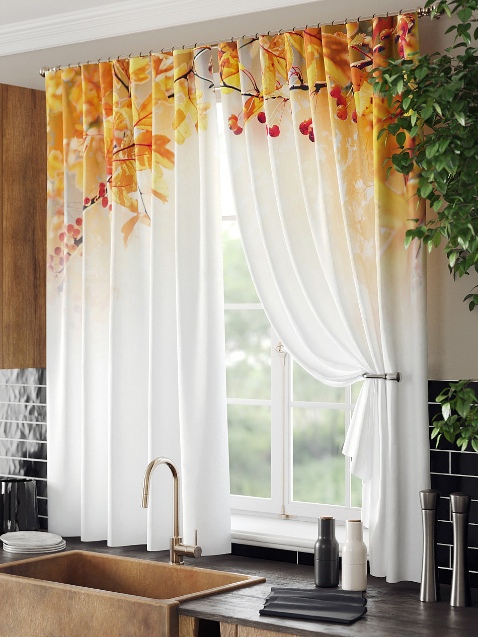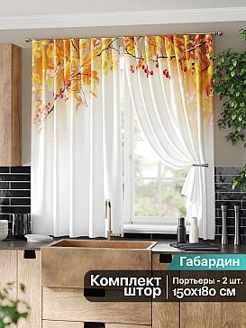 Комплект штор из легкой портьерной ткани (габардин) оформлен печатным рисунком. Печатный рисунок дает широкие возможности обновить интерьер фактически нет требуя ремонта за счет огромного выбора. Ткани с печатным рисунком безопасны и не содержат токсичных веществ. Не смотря на то что, материал легкий, он имеет высокую плотность, мало загрязнятся и не требует особого ухода даже после стирки, что важно для кухонных занавесок. Шторы не выцветают, не растягиваются, превосходно драпируются, образуя струящиеся складки. Прекрасное решение для создания красоты и уюта с помощью уникальных дизайнов.