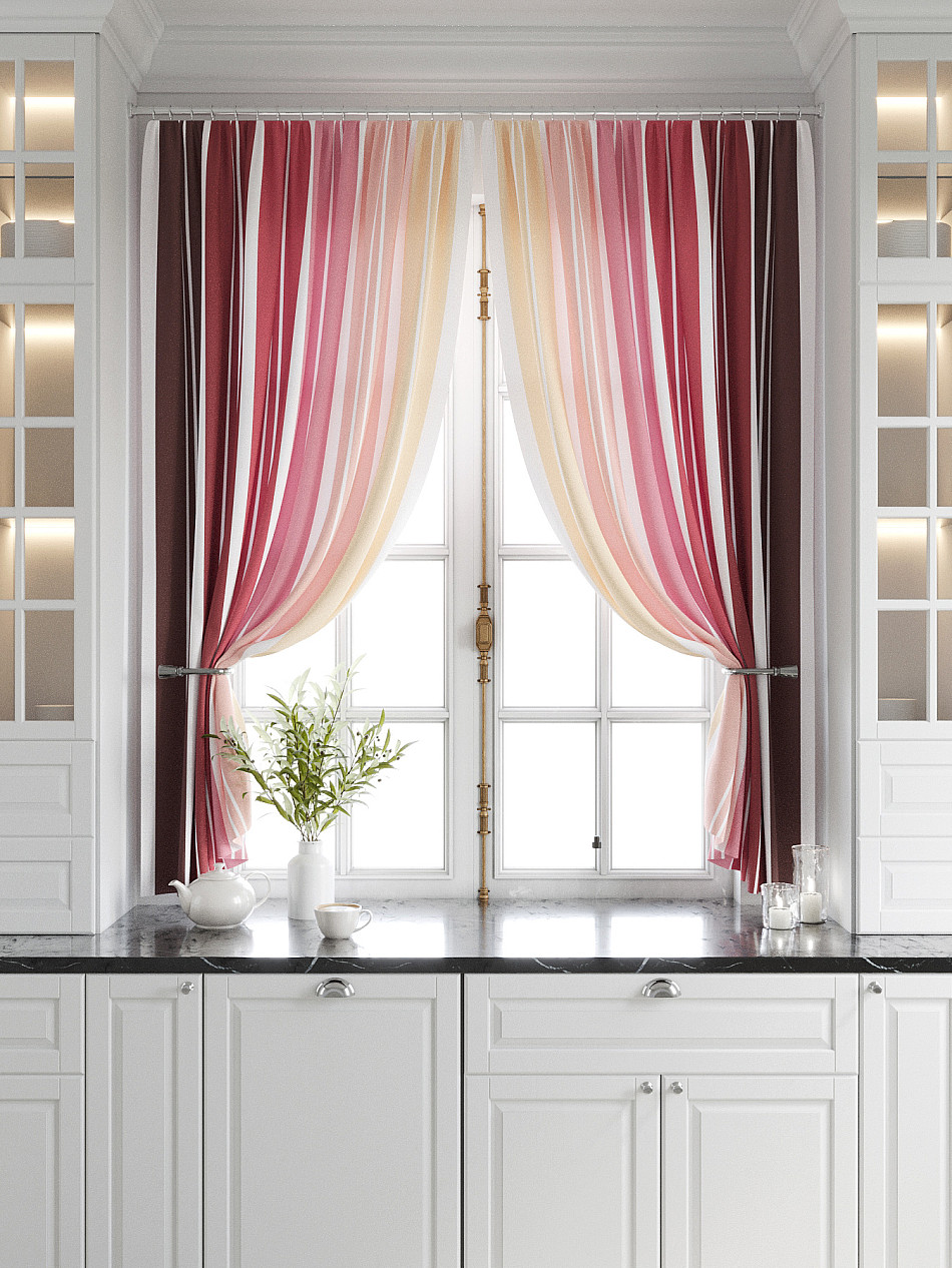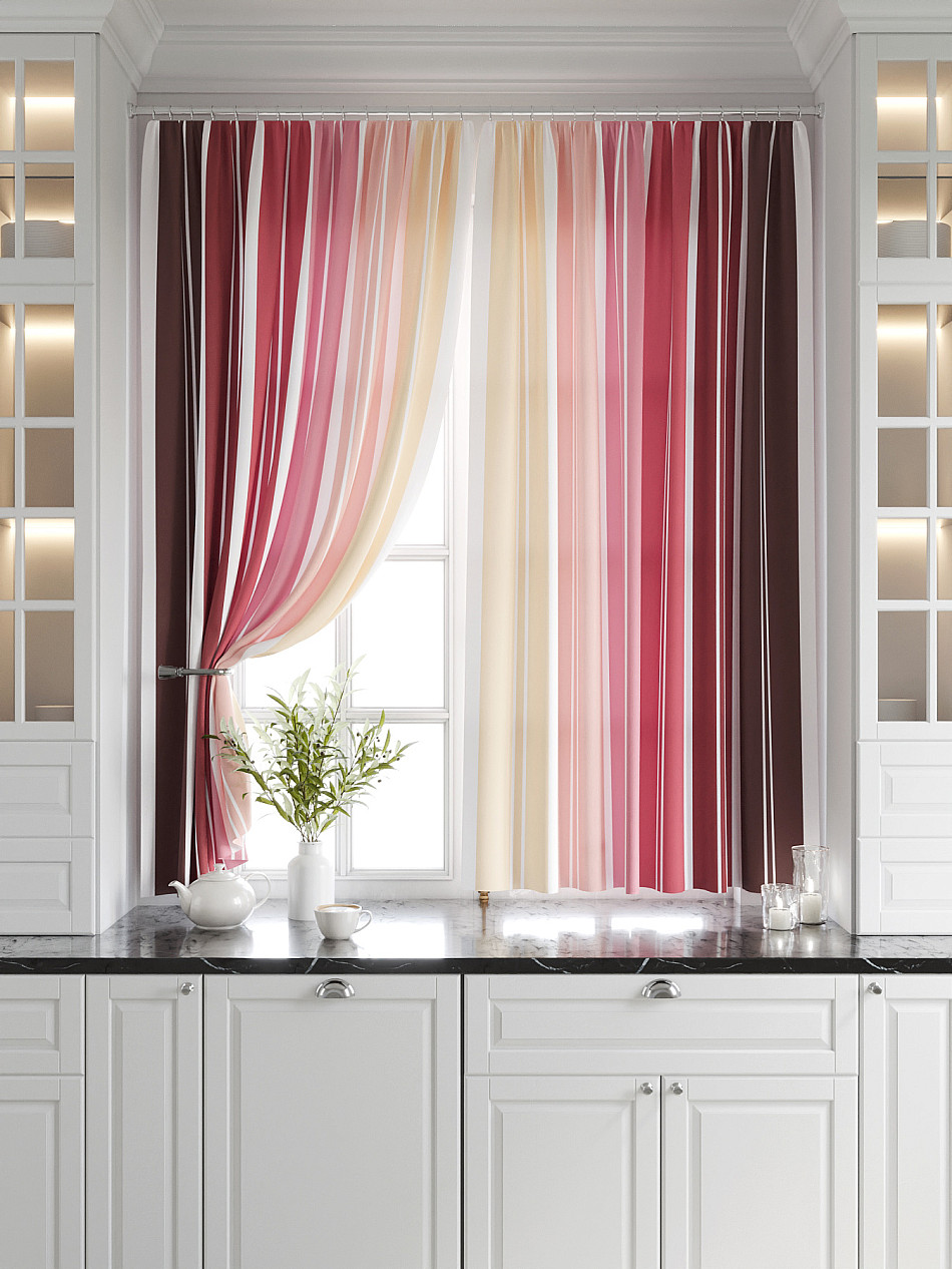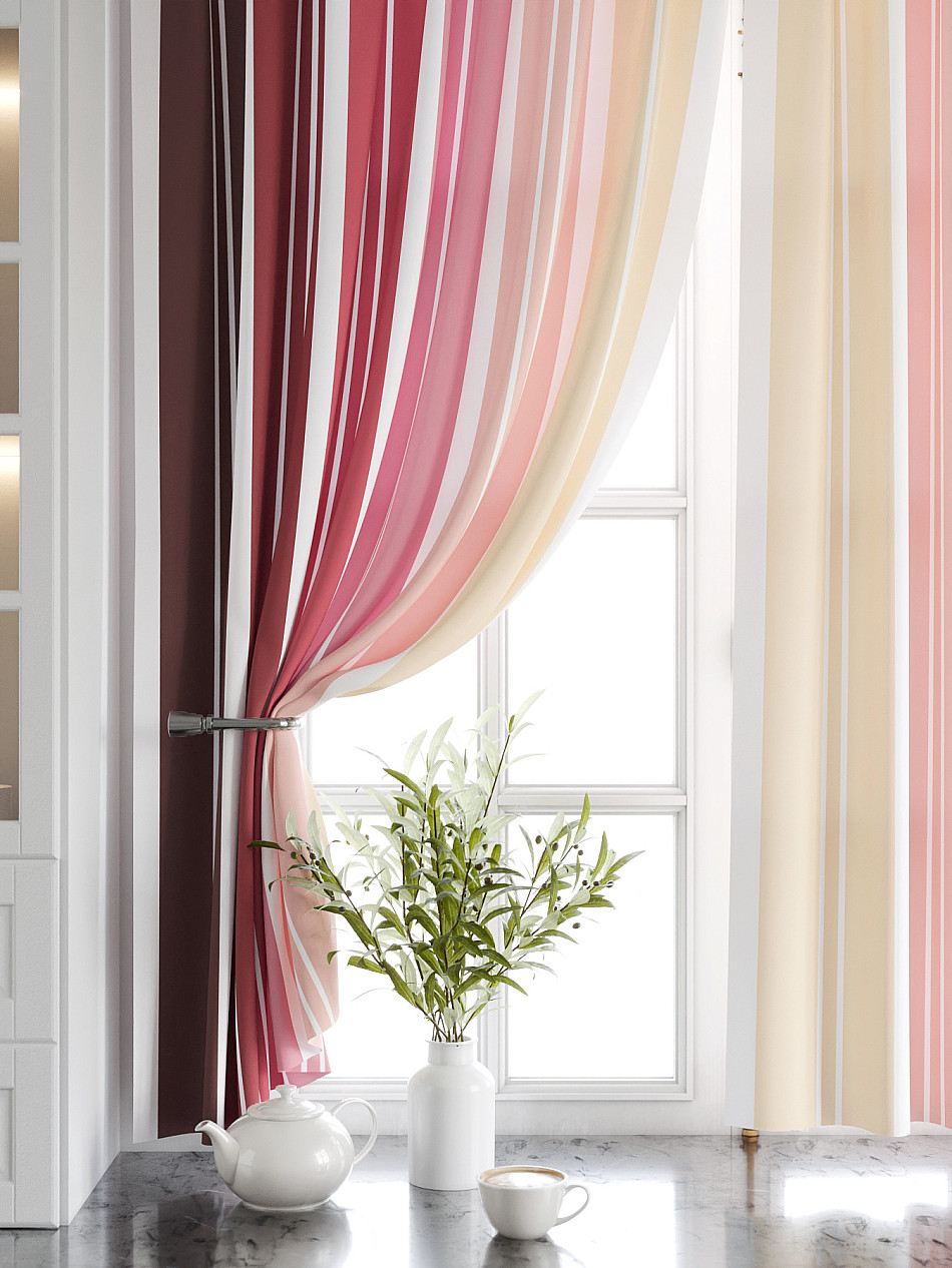 Комплект штор из легкой портьерной ткани (габардин) оформлен печатным рисунком. Печатный рисунок дает широкие возможности обновить интерьер фактически нет требуя ремонта за счет огромного выбора. Ткани с печатным рисунком безопасны и не содержат токсичных веществ. Не смотря на то что, материал легкий, он имеет высокую плотность, мало загрязнятся и не требует особого ухода даже после стирки, что важно для кухонных занавесок. Шторы не выцветают, не растягиваются, превосходно драпируются, образуя струящиеся складки. Прекрасное решение для создания красоты и уюта с помощью уникальных дизайнов.
