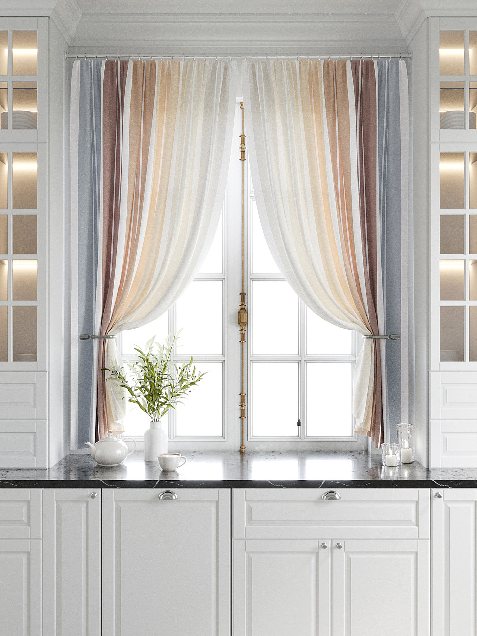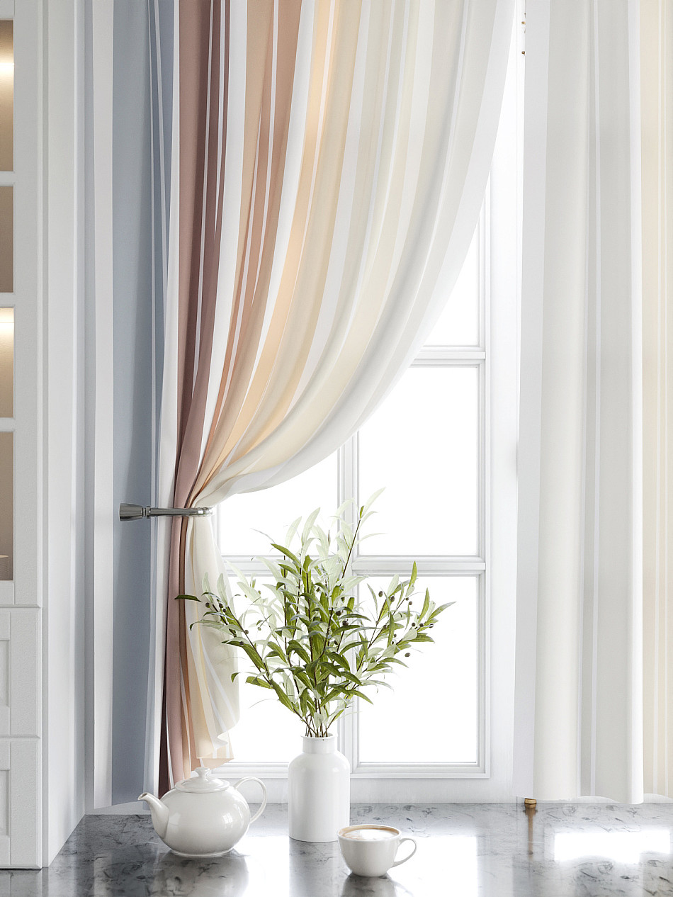 Комплект штор из легкой портьерной ткани (габардин) оформлен печатным рисунком. Печатный рисунок дает широкие возможности обновить интерьер фактически нет требуя ремонта за счет огромного выбора. Ткани с печатным рисунком безопасны и не содержат токсичных веществ. Не смотря на то что, материал легкий, он имеет высокую плотность, мало загрязнятся и не требует особого ухода даже после стирки, что важно для кухонных занавесок. Шторы не выцветают, не растягиваются, превосходно драпируются, образуя струящиеся складки. Прекрасное решение для создания красоты и уюта с помощью уникальных дизайнов.
