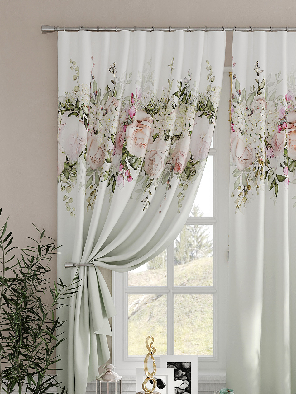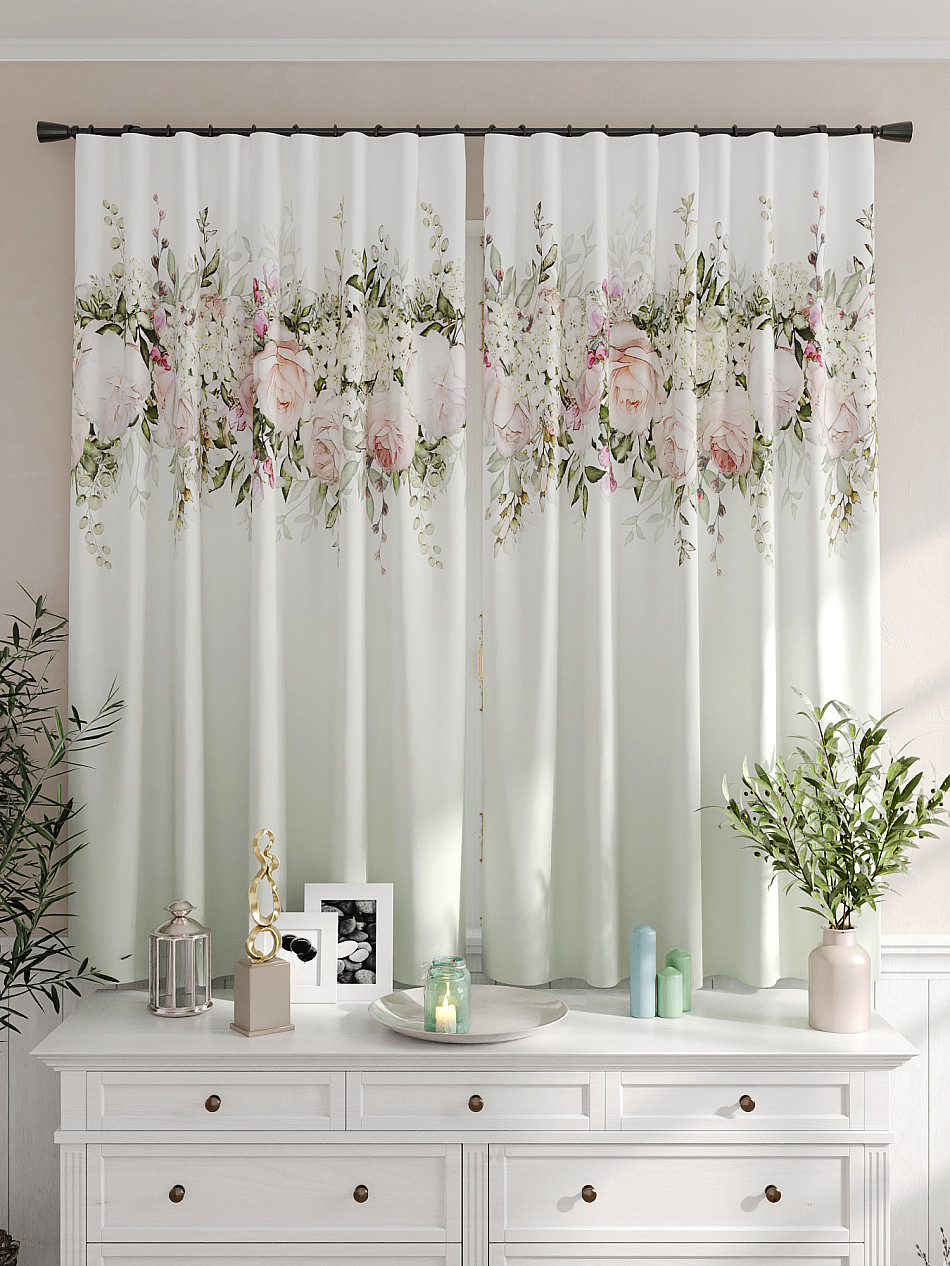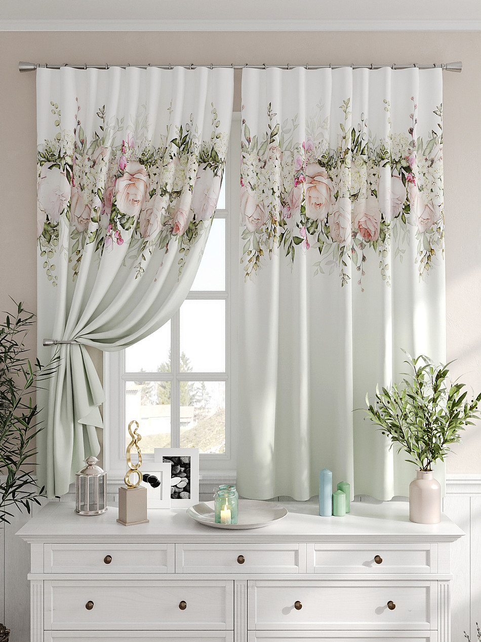 Портьеры 2 шт. Комплект штор из легкой портьерной ткани (габардин) оформлен печатным рисунком. Печатный рисунок дает широкие возможности обновить интерьер фактически не требуя ремонта за счет огромного выбора. Ткани с печатным рисунком безопасны и не содержат токсичных веществ. Не смотря на то, что материал легкий, он имеет высокую плотность, мало загрязнятся и не требует особого ухода даже после стирки, что важно для кухонных занавесок. Шторы не выцветают, не растягиваются, превосходно драпируются, образуя струящиеся складки. Прекрасное решение для создания красоты и уюта с помощью уникальных дизайнов.