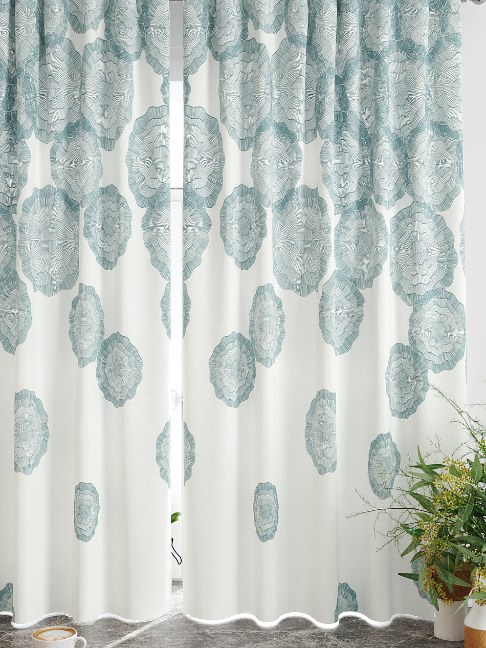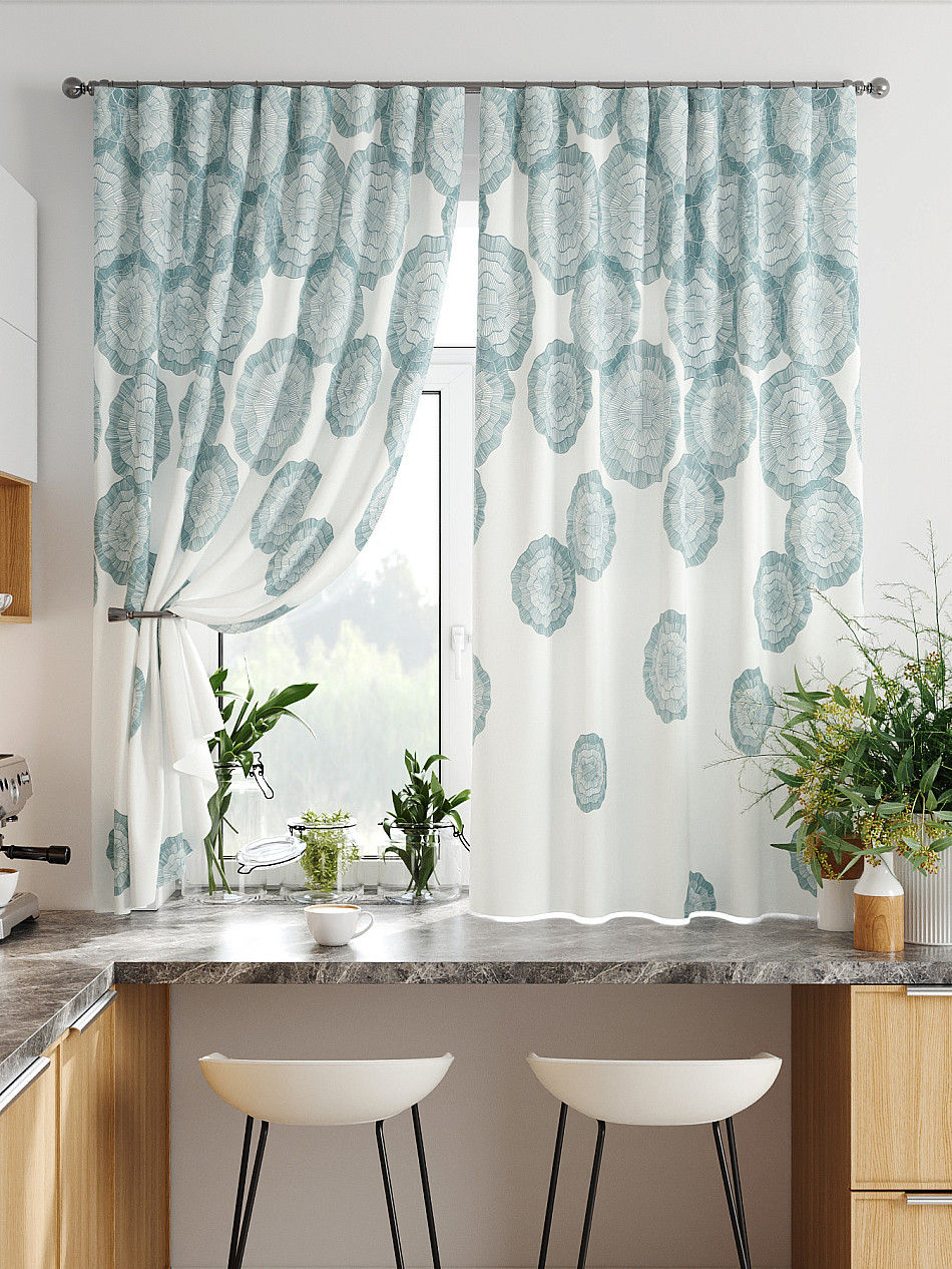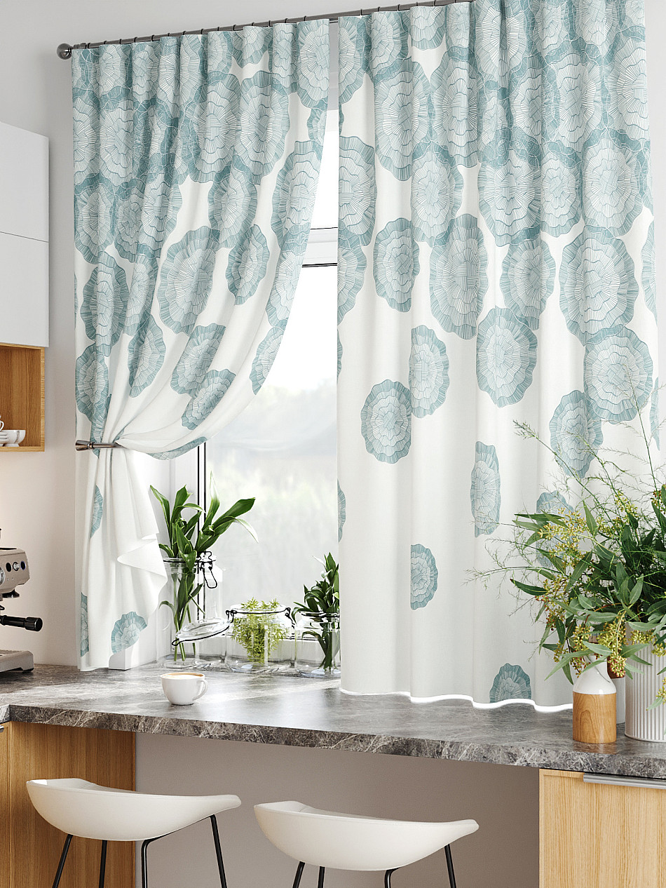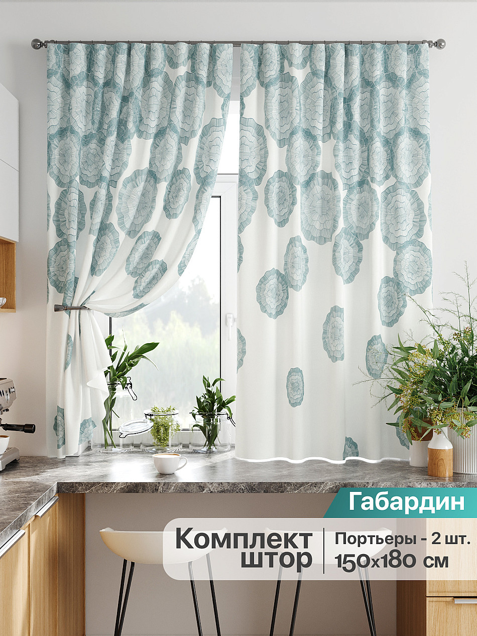 Комплект штор из легкой портьерной ткани (габардин) оформлен печатным рисунком. Печатный рисунок дает широкие возможности обновить интерьер фактически нет требуя ремонта за счет огромного выбора. Ткани с печатным рисунком безопасны и не содержат токсичных веществ. Не смотря на то что, материал легкий, он имеет высокую плотность, мало загрязнятся и не требует особого ухода даже после стирки, что важно для кухонных занавесок. Шторы не выцветают, не растягиваются, превосходно драпируются, образуя струящиеся складки. Прекрасное решение для создания красоты и уюта с помощью уникальных дизайнов.