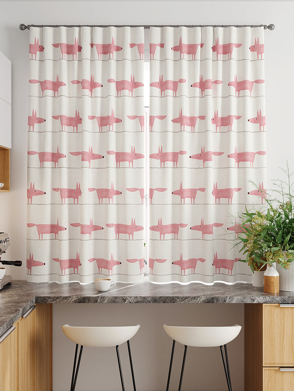 Комплект штор из легкой портьерной ткани (габардин) оформлен печатным рисунком. Печатный рисунок дает широкие возможности обновить интерьер фактически нет требуя ремонта за счет огромного выбора. Ткани с печатным рисунком безопасны и не содержат токсичных веществ. Не смотря на то что, материал легкий, он имеет высокую плотность, мало загрязнятся и не требует особого ухода даже после стирки, что важно для кухонных занавесок. Шторы не выцветают, не растягиваются, превосходно драпируются, образуя струящиеся складки. Прекрасное решение для создания красоты и уюта с помощью уникальных дизайнов.