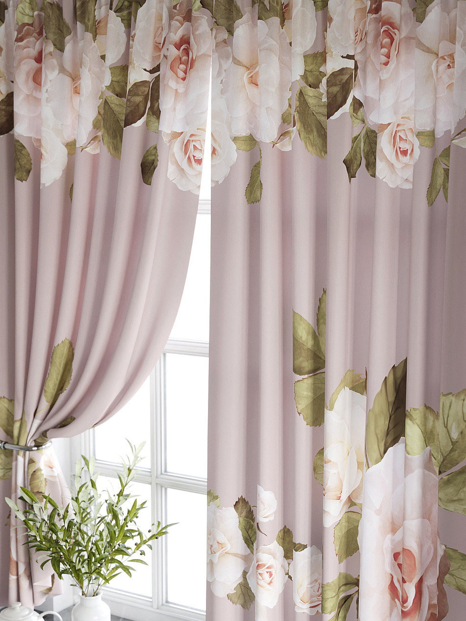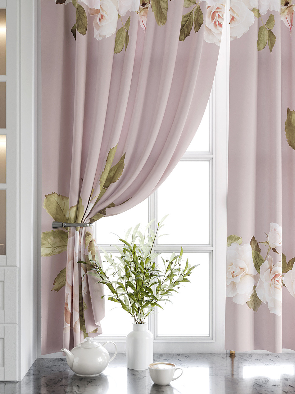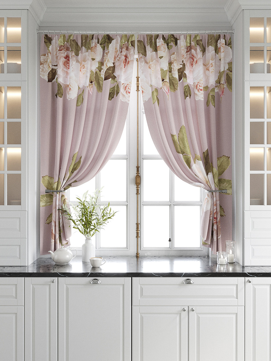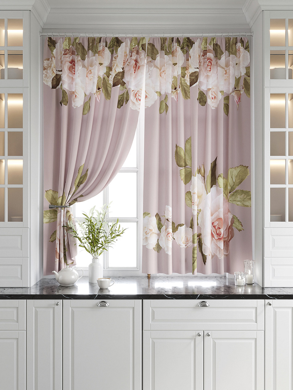 Комплект штор из легкой портьерной ткани (габардин) оформлен печатным рисунком. Печатный рисунок дает широкие возможности обновить интерьер фактически нет требуя ремонта за счет огромного выбора. Ткани с печатным рисунком безопасны и не содержат токсичных веществ. Не смотря на то что, материал легкий, он имеет высокую плотность, мало загрязнятся и не требует особого ухода даже после стирки, что важно для кухонных занавесок. Шторы не выцветают, не растягиваются, превосходно драпируются, образуя струящиеся складки. Прекрасное решение для создания красоты и уюта с помощью уникальных дизайнов.