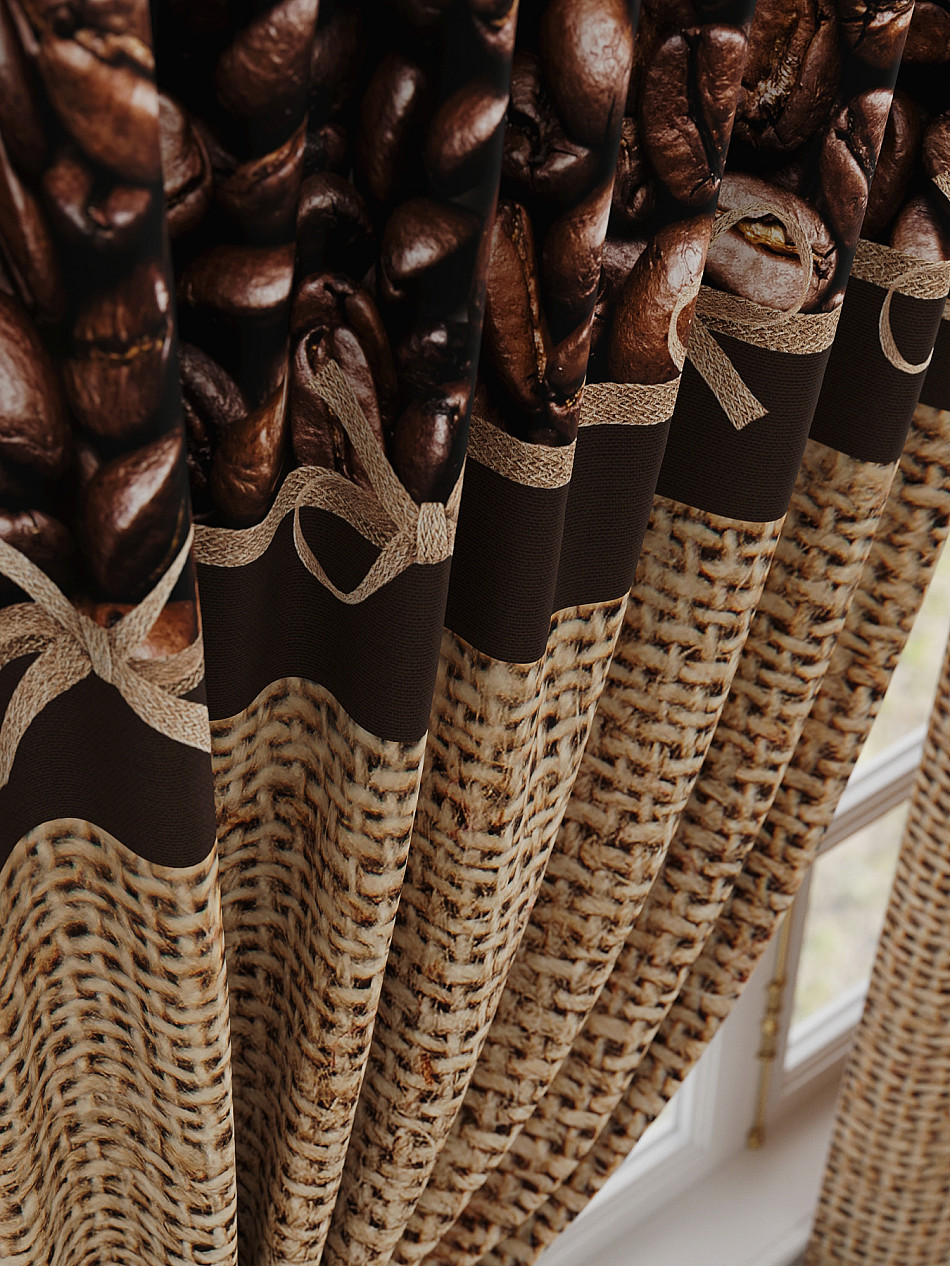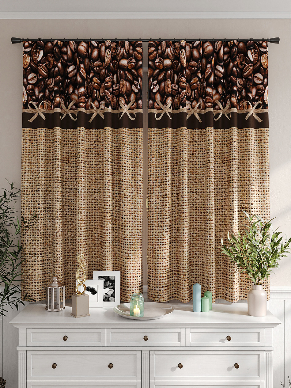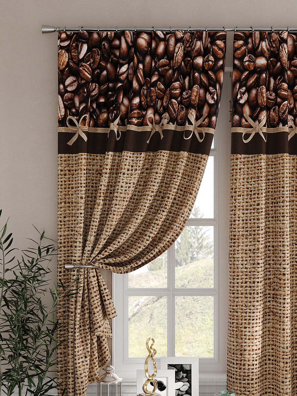 Портьеры 2 шт. Комплект штор из легкой портьерной ткани (габардин) оформлен печатным рисунком. Печатный рисунок дает широкие возможности обновить интерьер фактически не требуя ремонта за счет огромного выбора. Ткани с печатным рисунком безопасны и не содержат токсичных веществ. Не смотря на то, что материал легкий, он имеет высокую плотность, мало загрязнятся и не требует особого ухода даже после стирки, что важно для кухонных занавесок. Шторы не выцветают, не растягиваются, превосходно драпируются, образуя струящиеся складки. Прекрасное решение для создания красоты и уюта с помощью уникальных дизайнов.