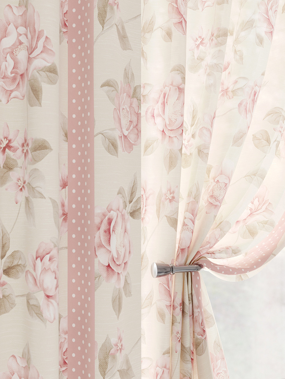 Тюль 2 шт.: Легкая основа (вуаль) оформлена флористическим рисунком. Ширина — 150 см., высота — 180 см., крепление — шторная лента (крючки).