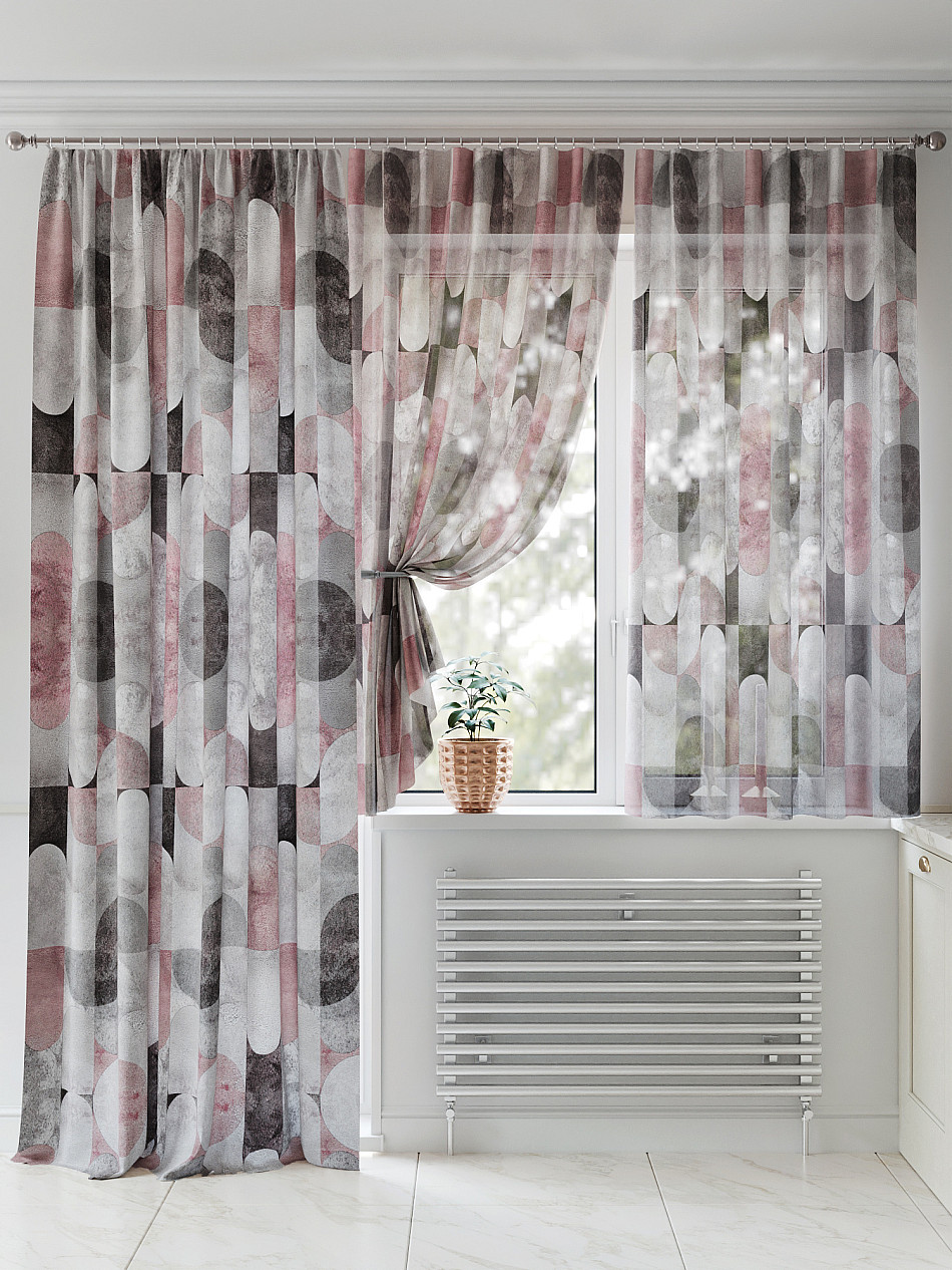 Портьера 150х250 см — 1 шт., вуаль 150х180 см — 2 шт. ( Уменьшить высоту ) Крепление: шторная лента (крючки), кулиска Подробнее