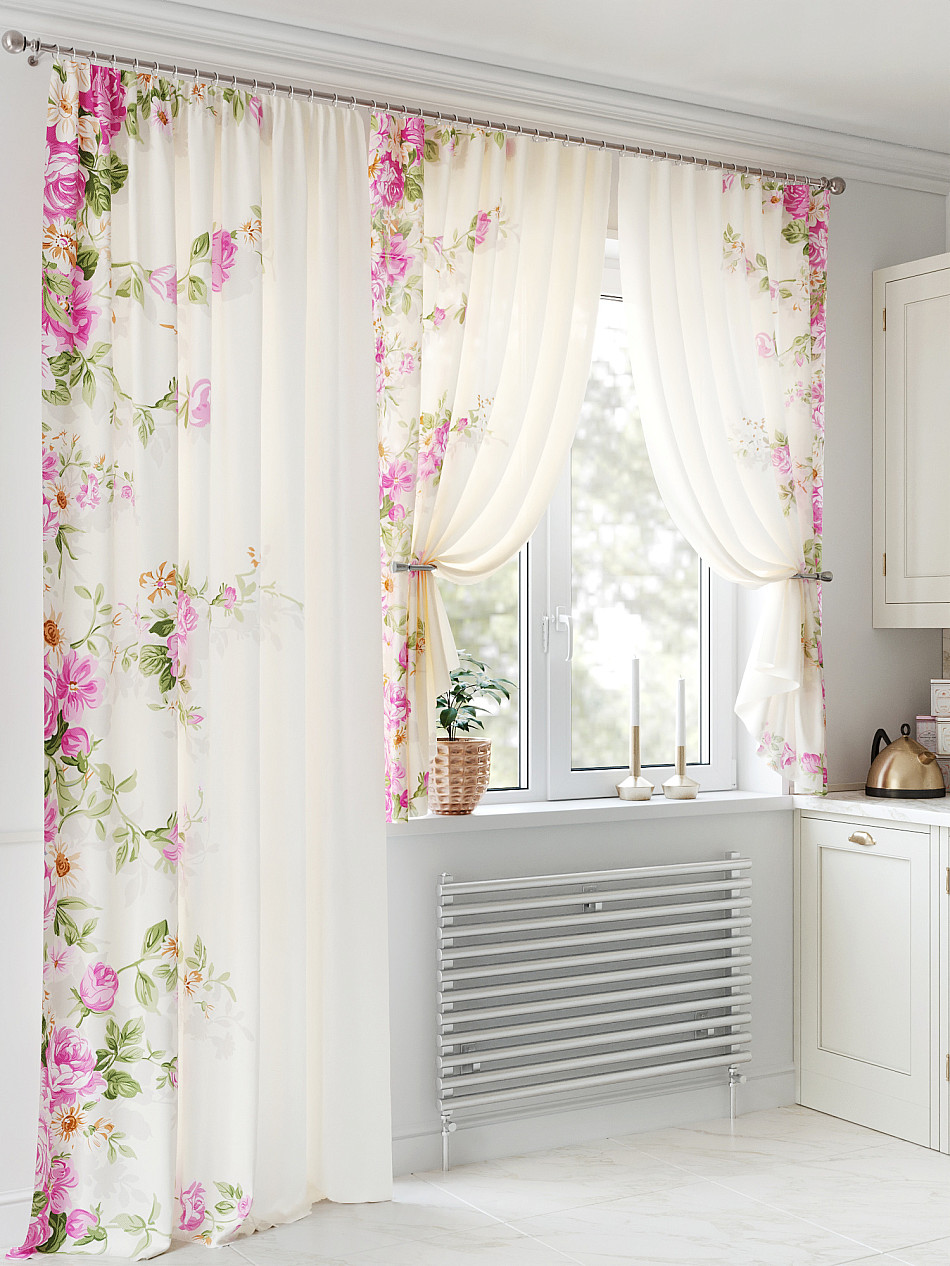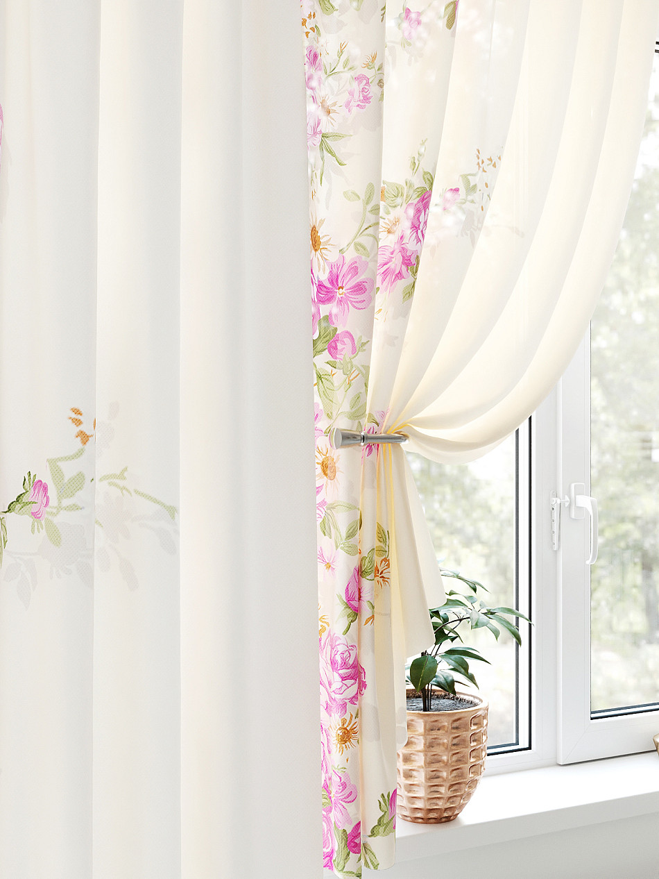 Тюль 2 шт.: Легкая основа (вуаль) оформлена флористическим рисунком. Ширина — 150 см., высота — 180 см., крепление — шторная лента (крючки).