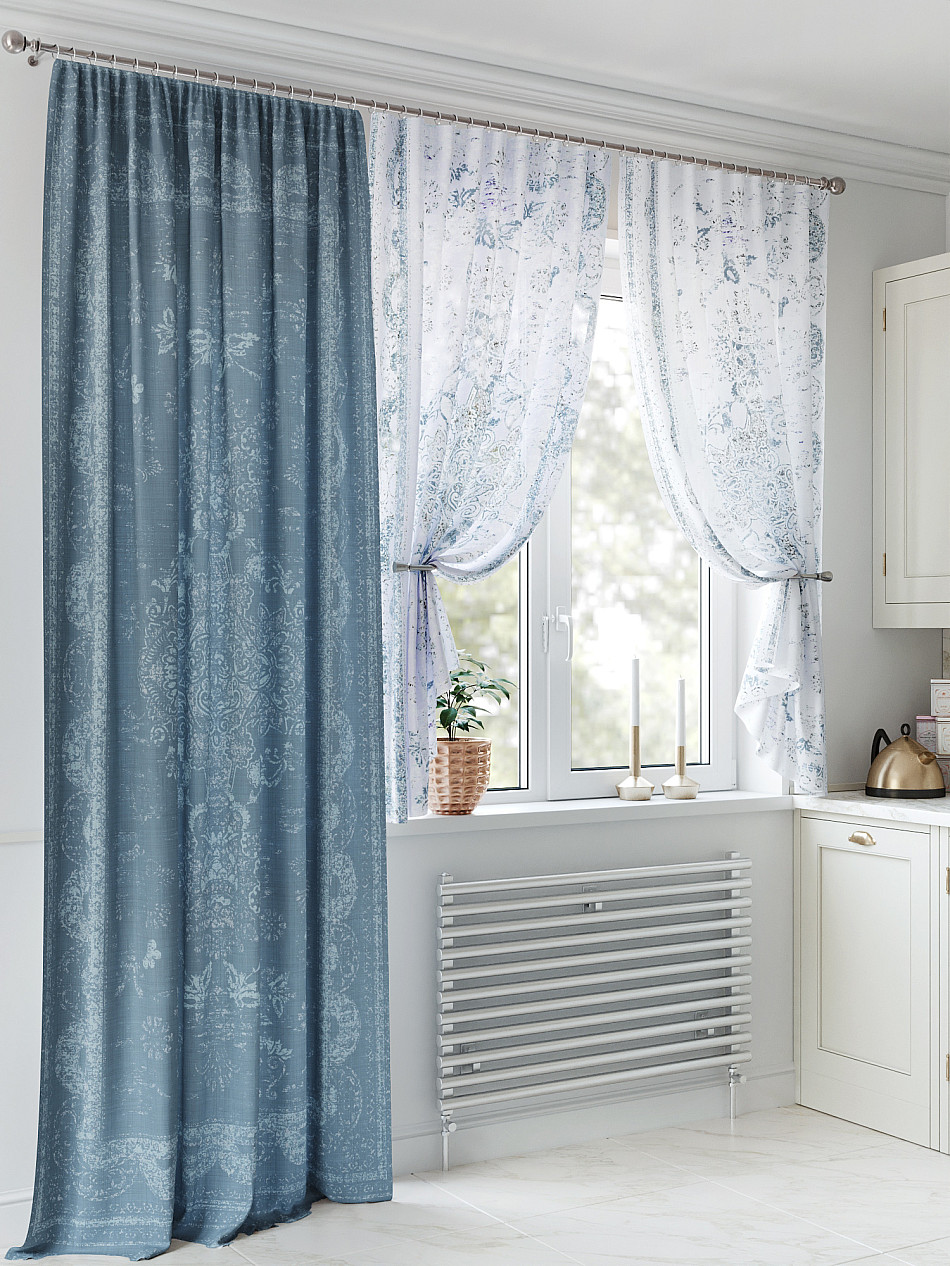 Портьера 150х250 см — 1 шт., вуаль 150х180 см — 2 шт. ( Уменьшить высоту ) Крепление: шторная лента (крючки), кулиска Подробнее