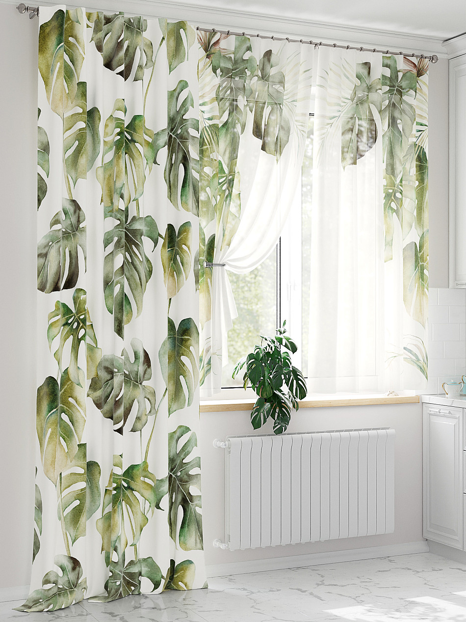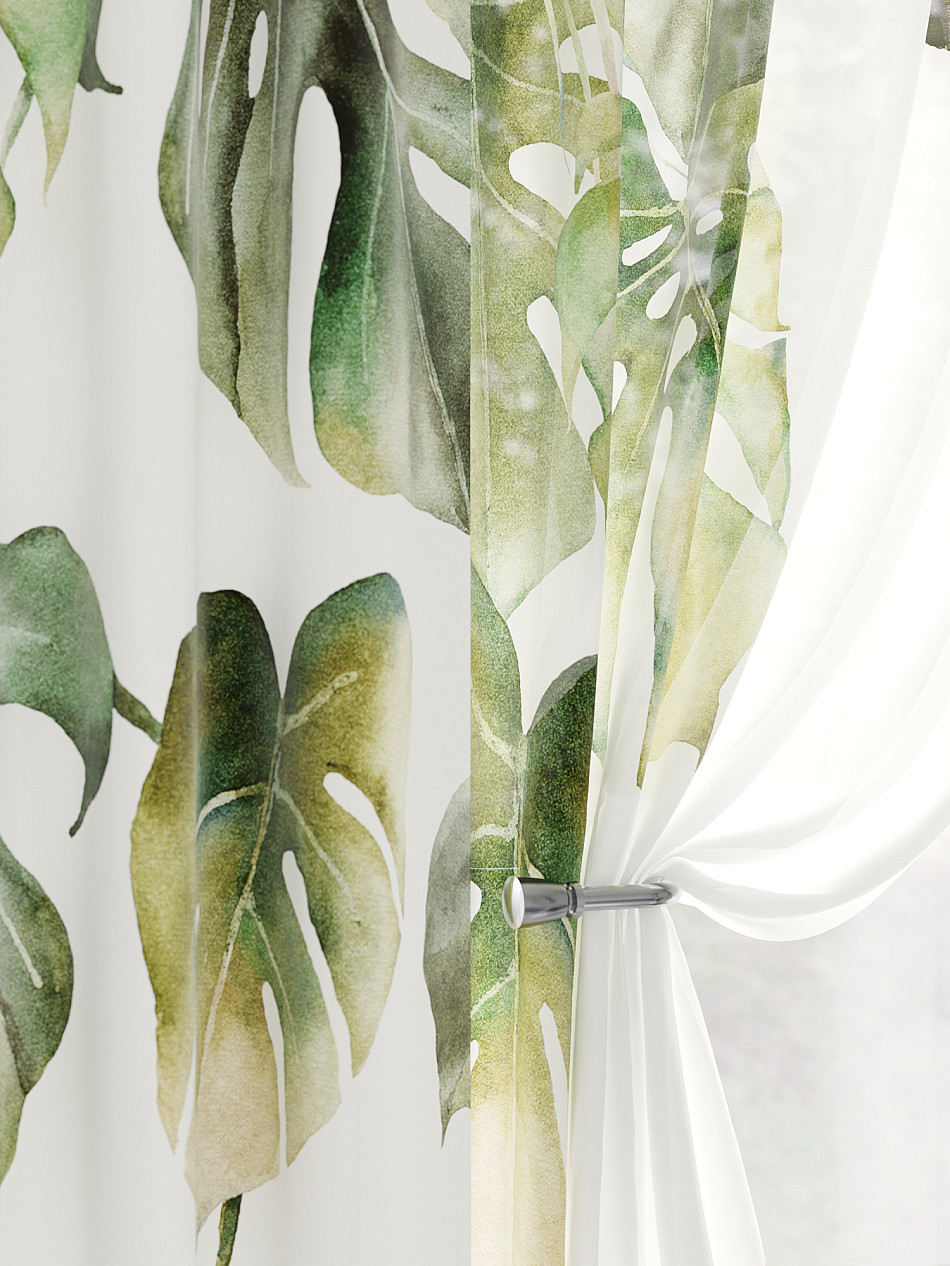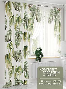 Тюль 2 шт.: Легкая основа (вуаль) оформлена тропическим рисунком. Ширина — 150 см., высота — 180 см., крепление — шторная лента (крючки).