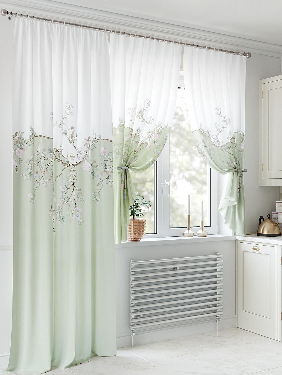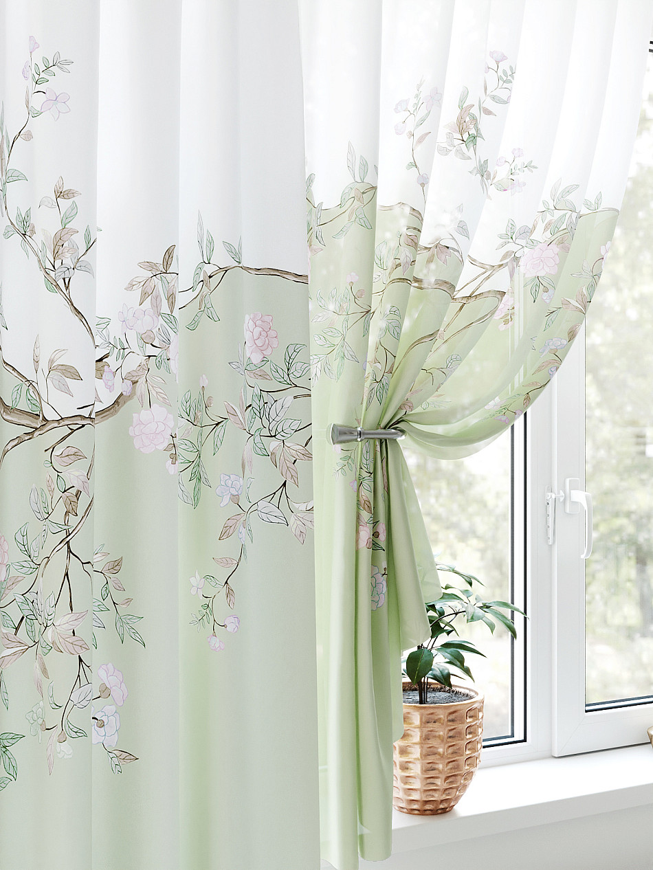 Тюль 2 шт.: Легкая основа (вуаль) оформлена флористическим рисунком. Ширина — 150 см., высота — 180 см., крепление — шторная лента (крючки).