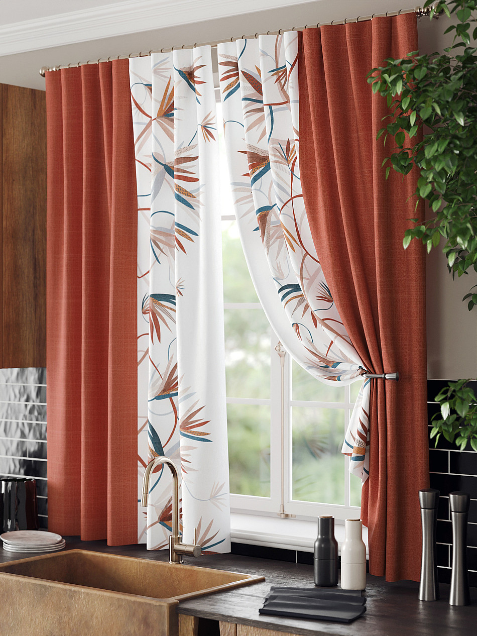 Комплект штор из легкой портьерной ткани (габардин) оформлен печатным рисунком. Печатный рисунок дает широкие возможности обновить интерьер фактически нет требуя ремонта за счет огромного выбора. Ткани с печатным рисунком безопасны и не содержат токсичных веществ. Не смотря на то что, материал легкий, он имеет высокую плотность, мало загрязнятся и не требует особого ухода даже после стирки, что важно для кухонных занавесок. Шторы не выцветают, не растягиваются, превосходно драпируются, образуя струящиеся складки. Прекрасное решение для создания красоты и уюта с помощью уникальных дизайнов.