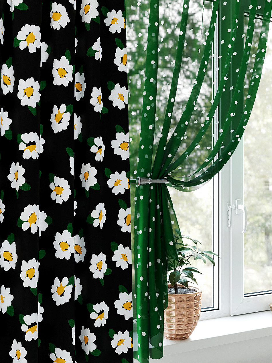 Тюль 2 шт.: Легкая основа (вуаль) оформлена флористическим рисунком. Ширина — 150 см., высота — 180 см., крепление — шторная лента (крючки).