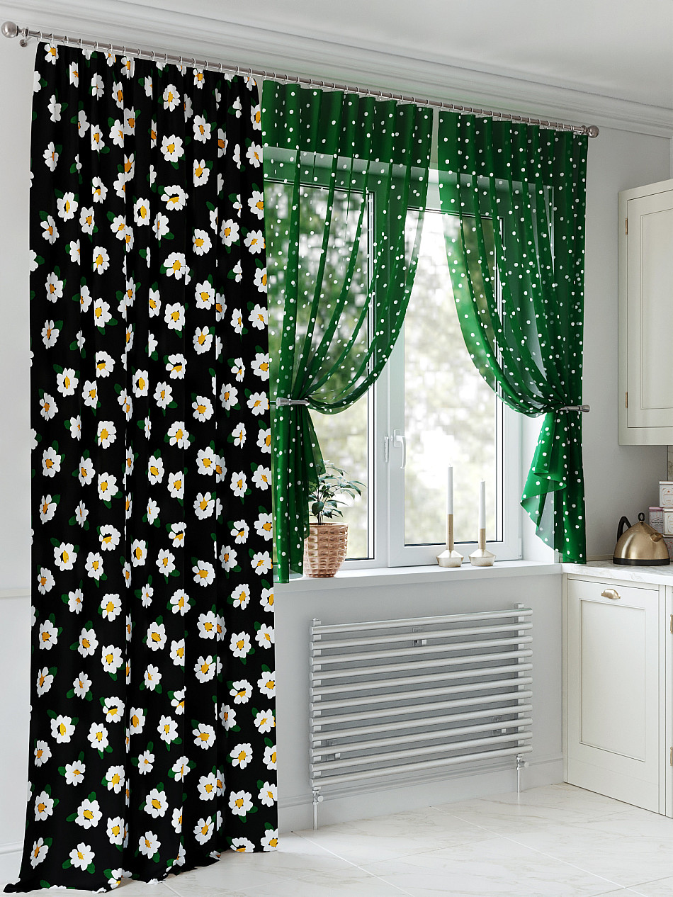 Портьера 150х250 см — 1 шт., вуаль 150х180 см — 2 шт. ( Уменьшить высоту ) Крепление: шторная лента (крючки), кулиска Подробнее