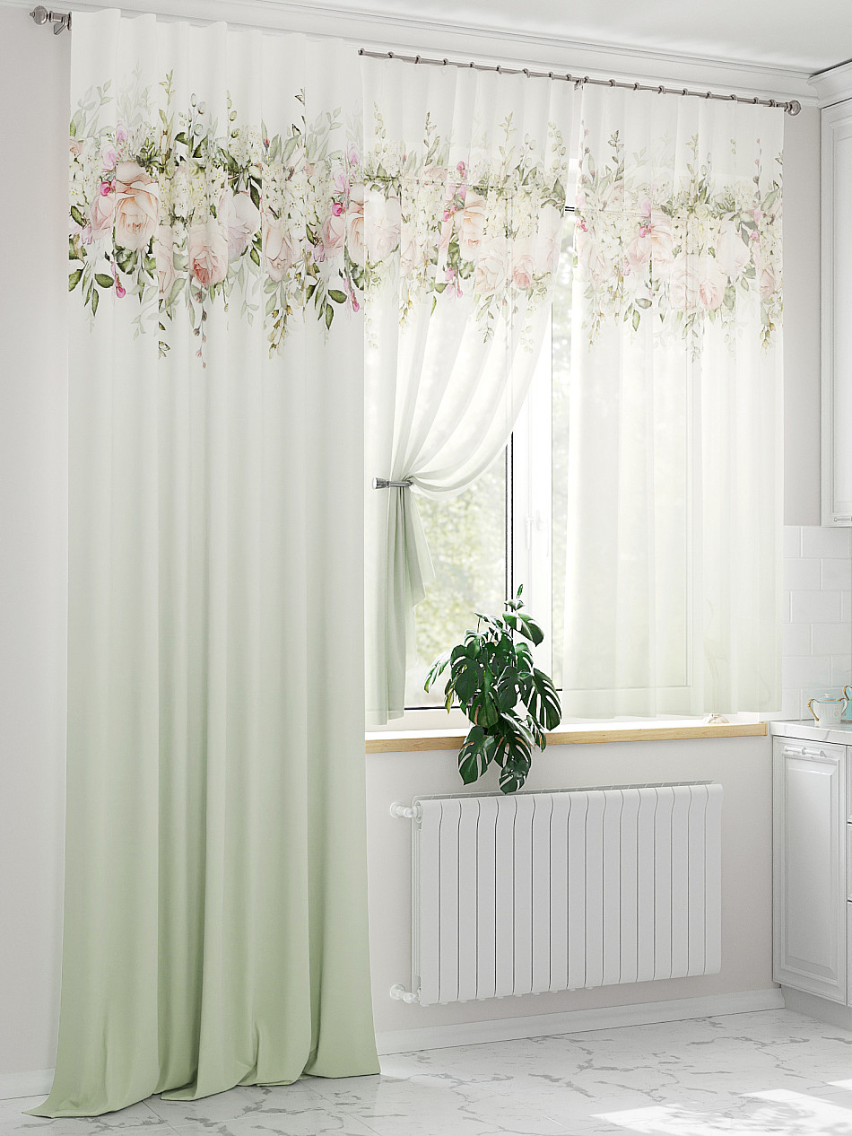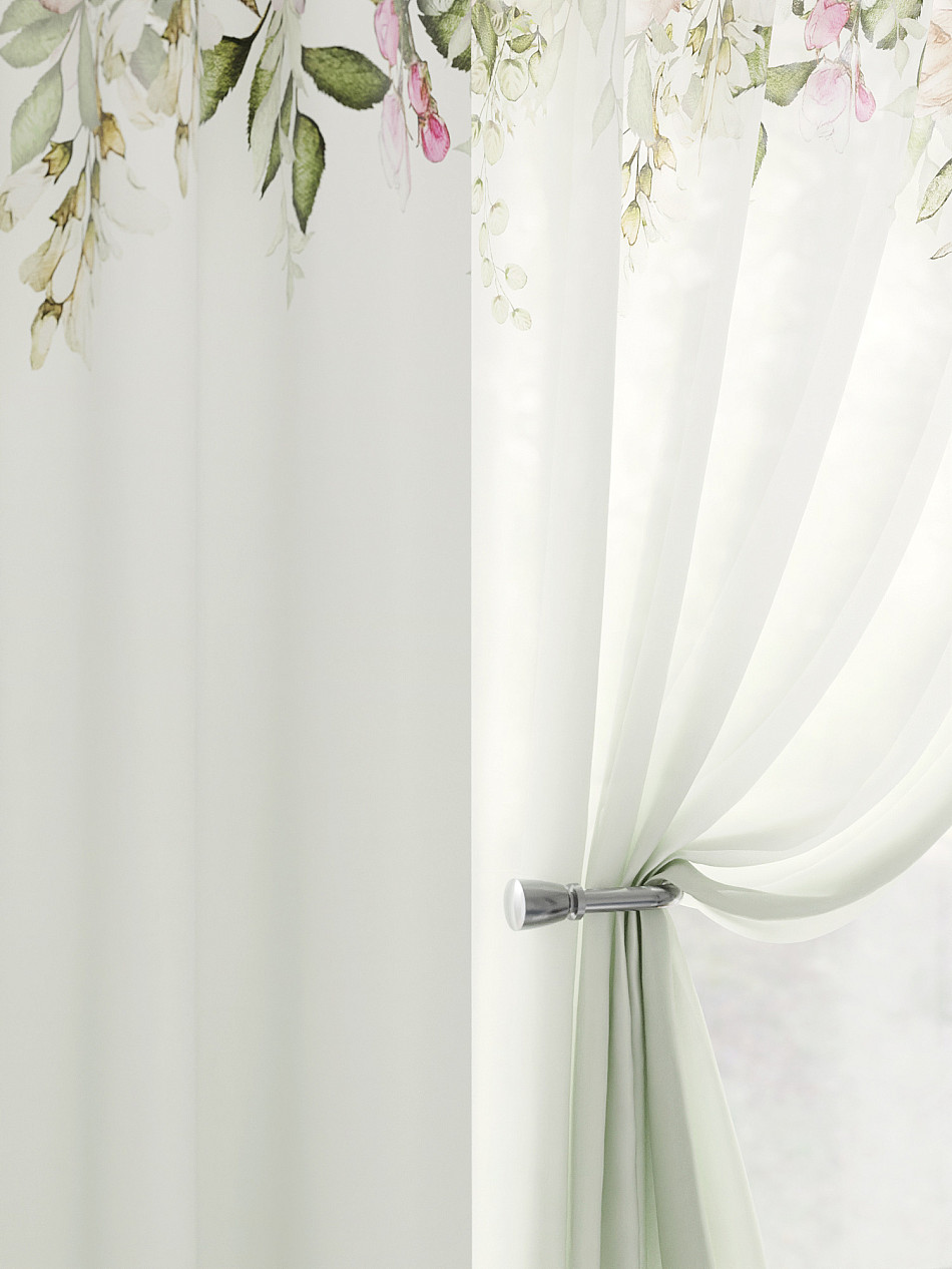 Все отлично! Шторы очень нежные, красивые! Мы остались довольны! Фон нежно зелёный переходящий в белый, цветы нежно розовые с бежевым.