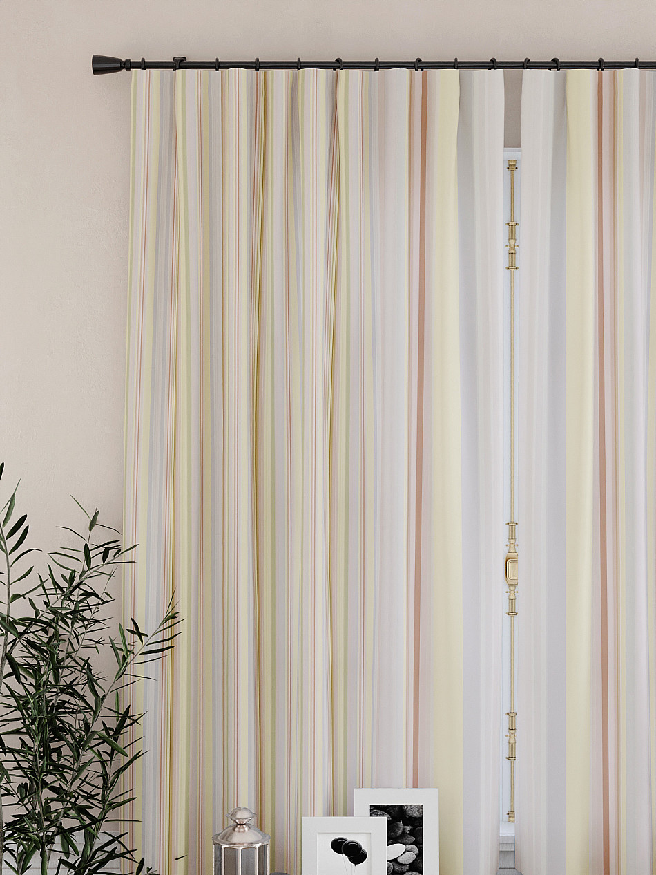 По верхнему краю портьер пришита шторная тесьма 6 см, с ее помощью затянув узелки от кордовых нитей с обеих сторон и стянув их до нужного размера можно сформировать округлые складки, далее вставить крючки в кармашки и повесить на карниз. Обязательно проверьте кордовые нити – они должны быть надежно завязаны, в противном случае во время стягивания они могут вылететь. Шторная тесьма имеет два ряда кармашков, с их помощью можно регулировать не только длину, но и ширину. Такое крепление подходит для всех типов карнизов.