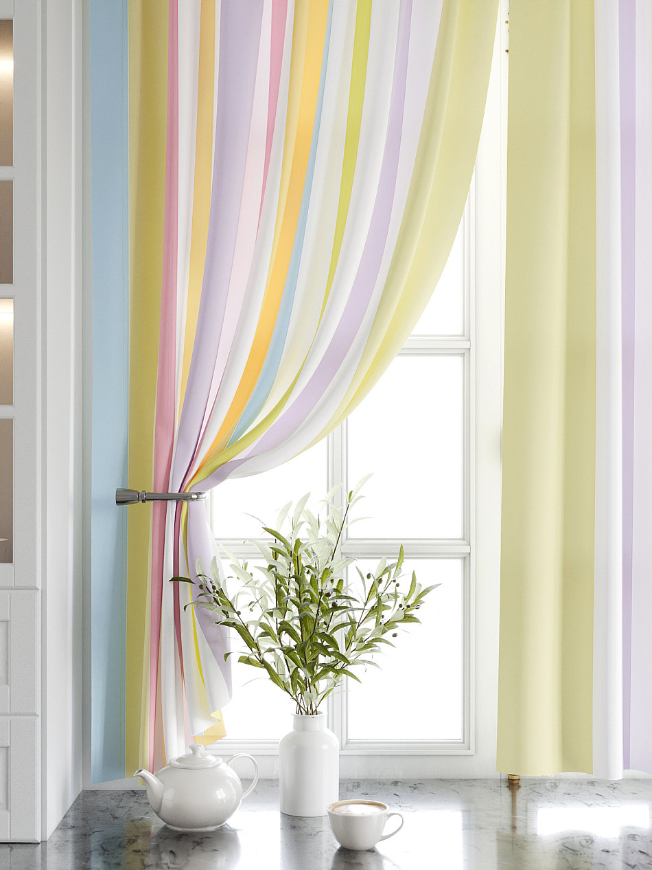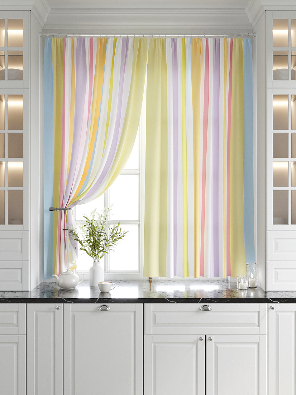 Комплект штор из легкой портьерной ткани (габардин) оформлен печатным рисунком. Печатный рисунок дает широкие возможности обновить интерьер фактически нет требуя ремонта за счет огромного выбора. Ткани с печатным рисунком безопасны и не содержат токсичных веществ. Не смотря на то что, материал легкий, он имеет высокую плотность, мало загрязнятся и не требует особого ухода даже после стирки, что важно для кухонных занавесок. Шторы не выцветают, не растягиваются, превосходно драпируются, образуя струящиеся складки. Прекрасное решение для создания красоты и уюта с помощью уникальных дизайнов.