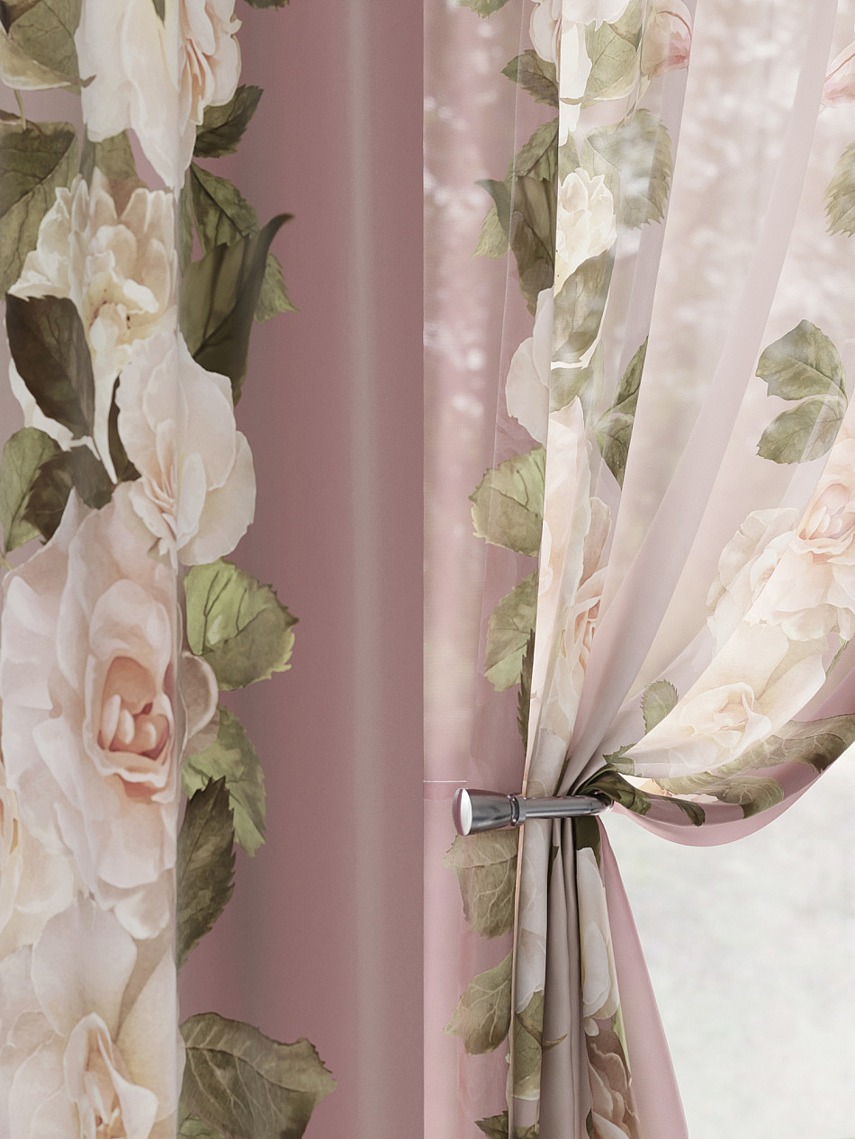 Тюль 2 шт.: Легкая основа (вуаль) оформлена флористическим рисунком. Ширина — 150 см., высота — 180 см., крепление — шторная лента (крючки).