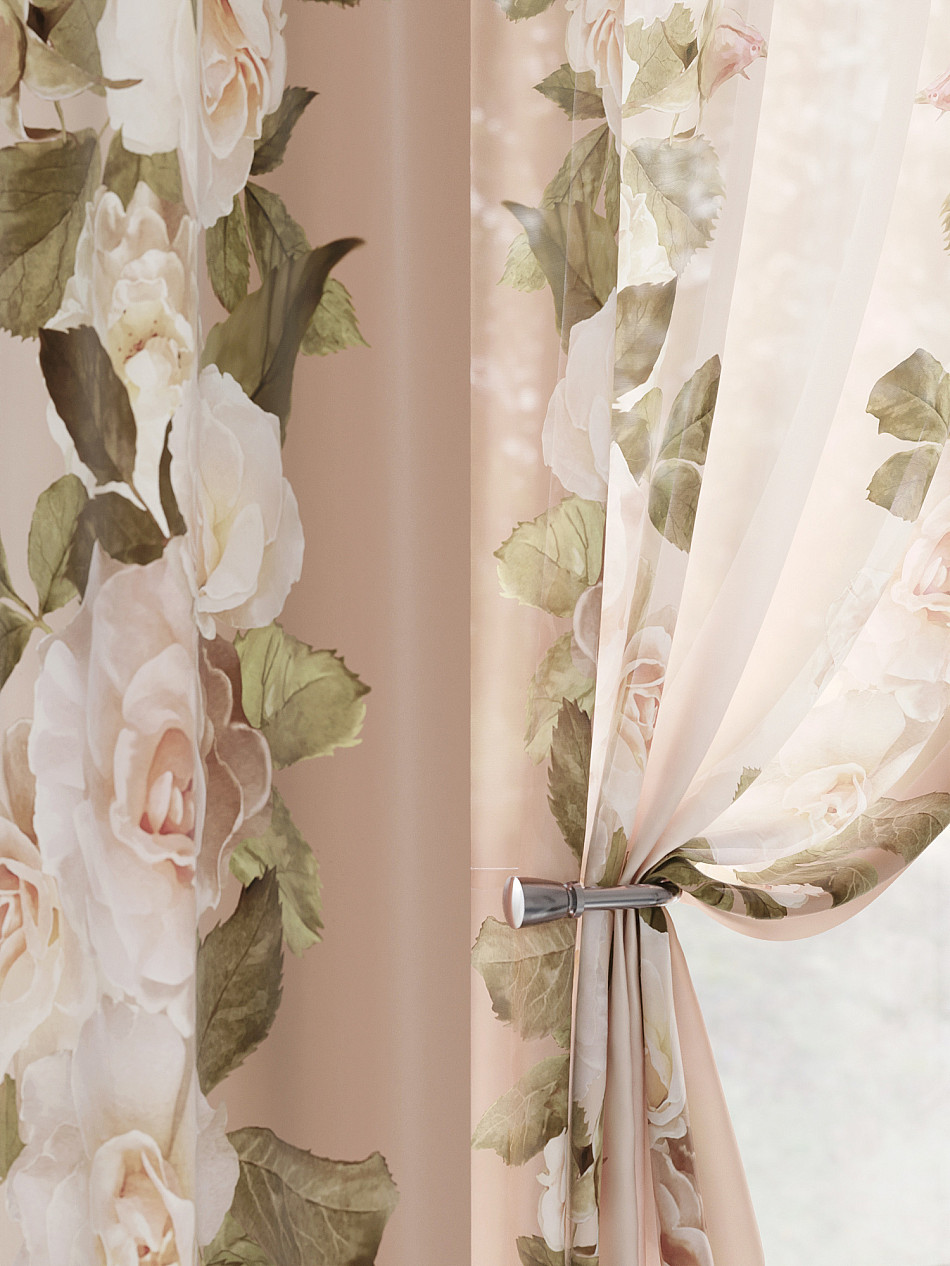 Тюль 2 шт.: Легкая основа (вуаль) оформлена флористическим рисунком. Ширина — 150 см., высота — 180 см., крепление — шторная лента (крючки).