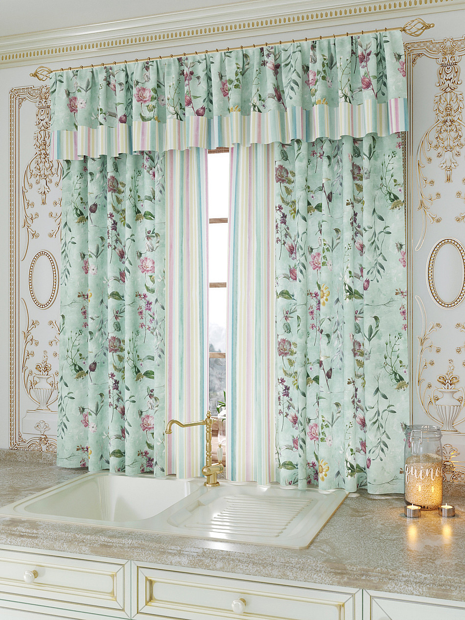 Ламбрекен: легкая основа (Габардин). Ширина — 300 см, высота — 40 см, крепление — шторная лента (крючки).