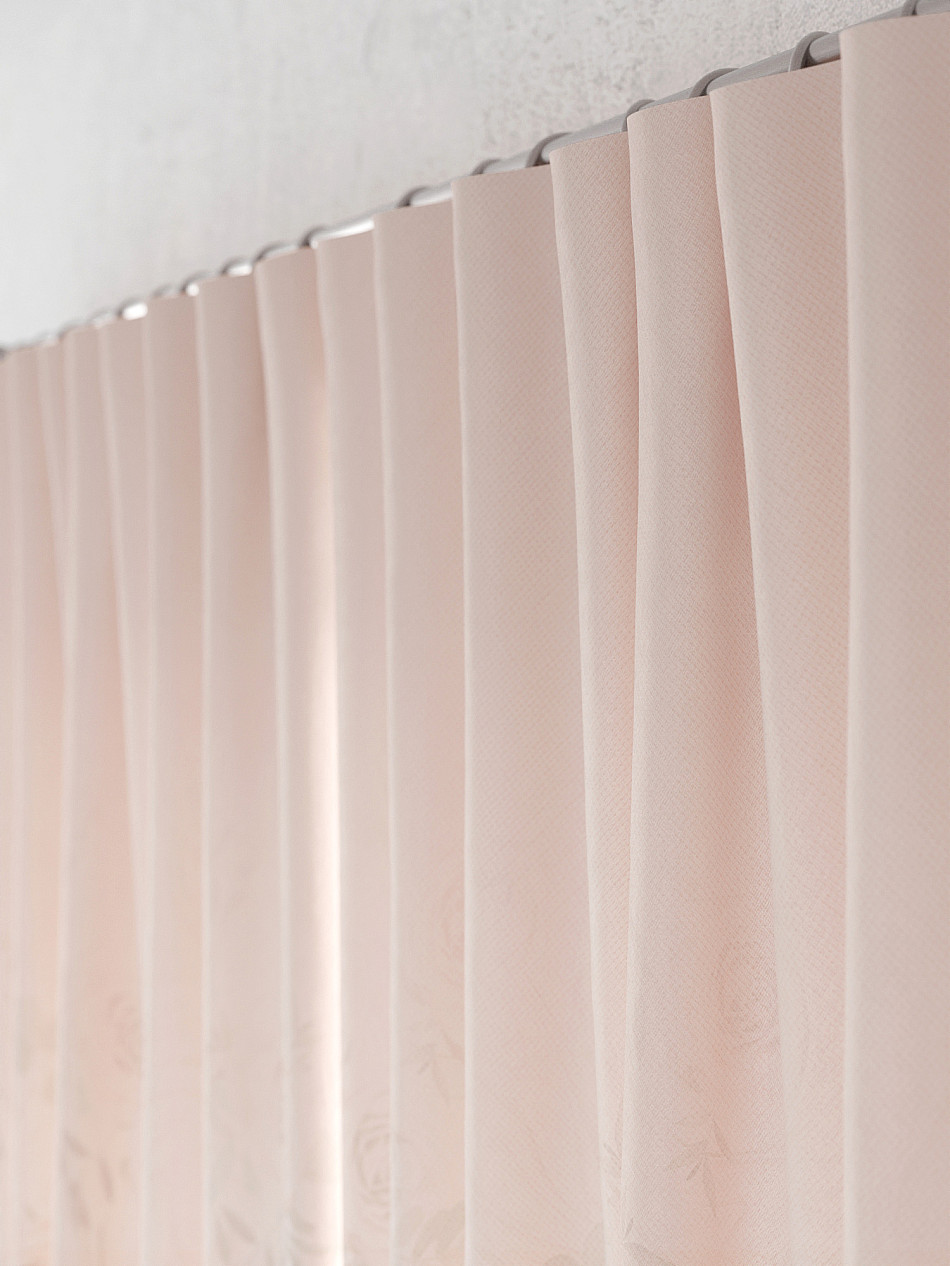 По верхнему краю портьер пришита шторная тесьма 6 см, с ее помощью затянув узелки от кордовых нитей с обеих сторон и стянув их до нужного размера можно сформировать округлые складки, далее вставить крючки в кармашки и повесить на карниз. Обязательно проверьте кордовые нити – они должны быть надежно завязаны, в противном случае во время стягивания они могут вылететь. Шторная тесьма имеет два ряда кармашков, с их помощью можно регулировать не только длину, но и ширину. Такое крепление подходит для всех типов карнизов.