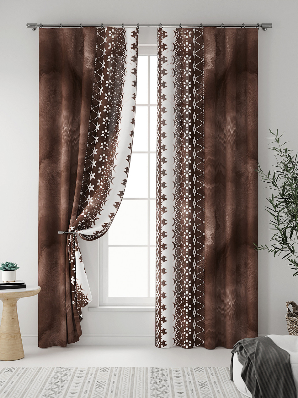 Комплект штор из легкой портьерной ткани (габардин) оформлен печатным рисунком. Печатный рисунок дает широкие возможности обновить интерьер фактически нет требуя ремонта за счет огромного выбора. Ткани с печатным рисунком безопасны и не содержат токсичных веществ. Не смотря на то что, материал легкий, он имеет высокую плотность, мало загрязнятся и не требует особого ухода даже после стирки, что важно для кухонных занавесок. Шторы не выцветают, не растягиваются, превосходно драпируются, образуя струящиеся складки. Прекрасное решение для создания красоты и уюта с помощью уникальных дизайнов.