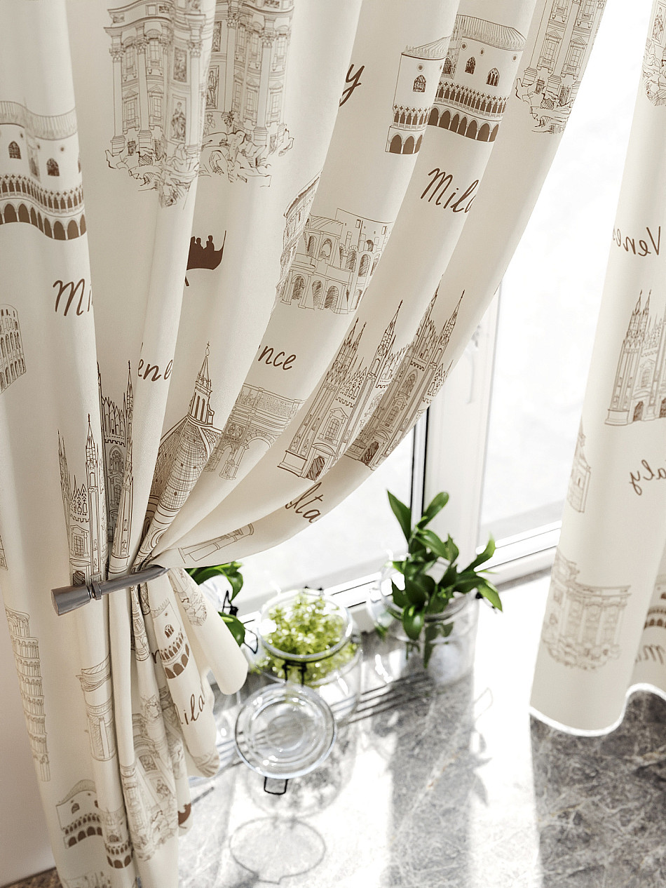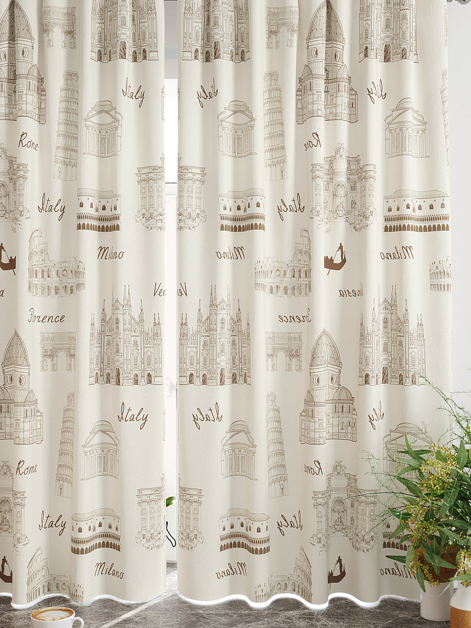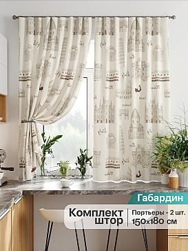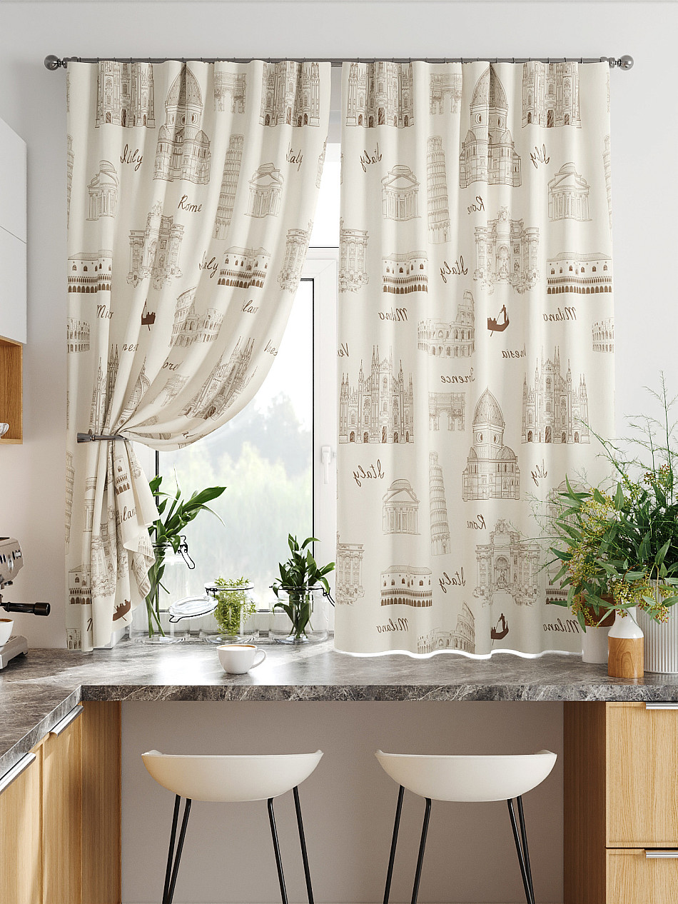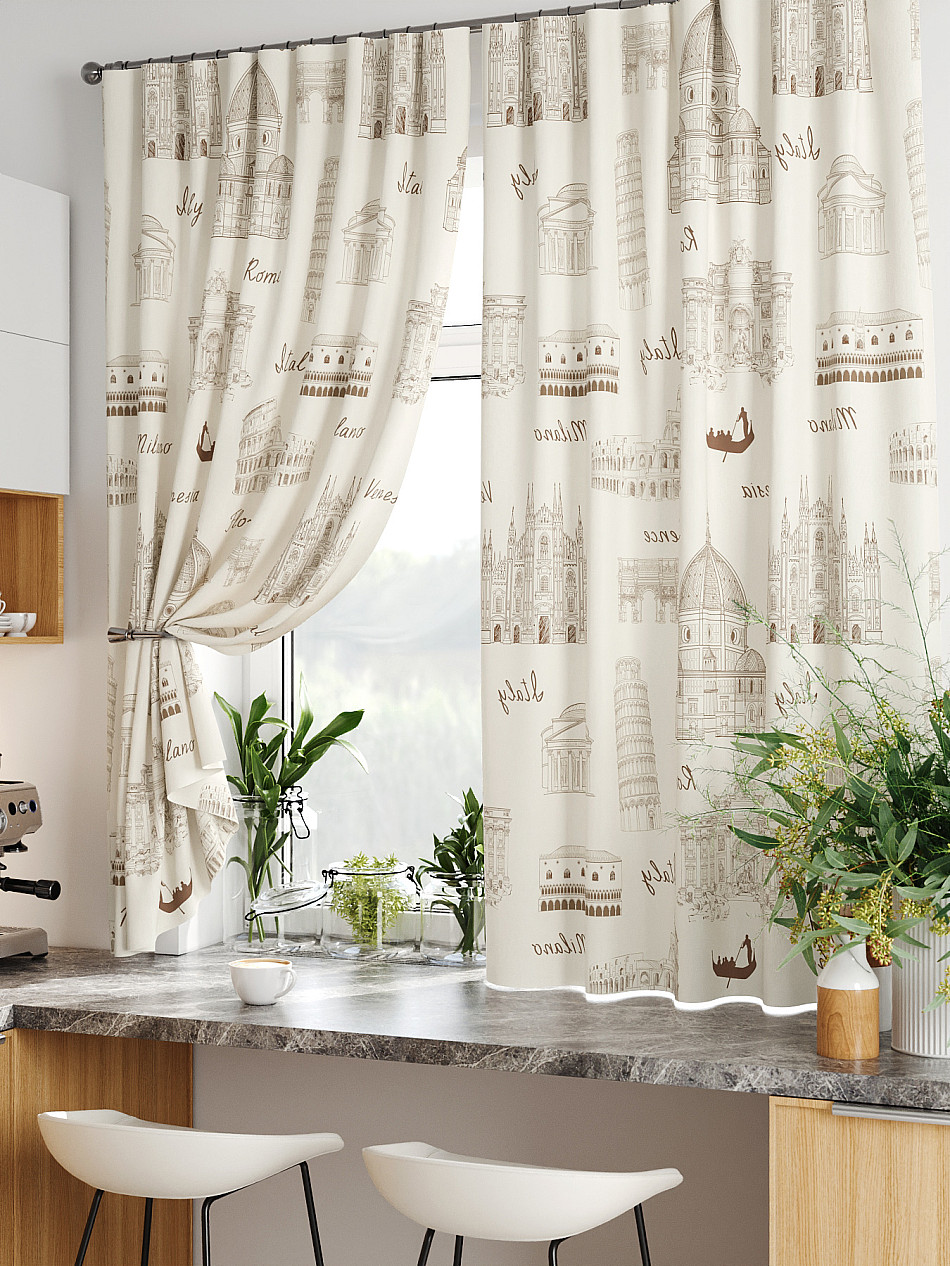 Комплект штор из легкой портьерной ткани (габардин) оформлен печатным рисунком. Печатный рисунок дает широкие возможности обновить интерьер фактически нет требуя ремонта за счет огромного выбора. Ткани с печатным рисунком безопасны и не содержат токсичных веществ. Не смотря на то что, материал легкий, он имеет высокую плотность, мало загрязнятся и не требует особого ухода даже после стирки, что важно для кухонных занавесок. Шторы не выцветают, не растягиваются, превосходно драпируются, образуя струящиеся складки. Прекрасное решение для создания красоты и уюта с помощью уникальных дизайнов.