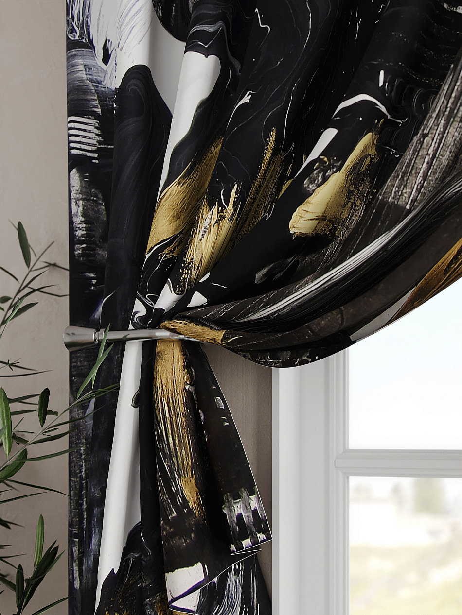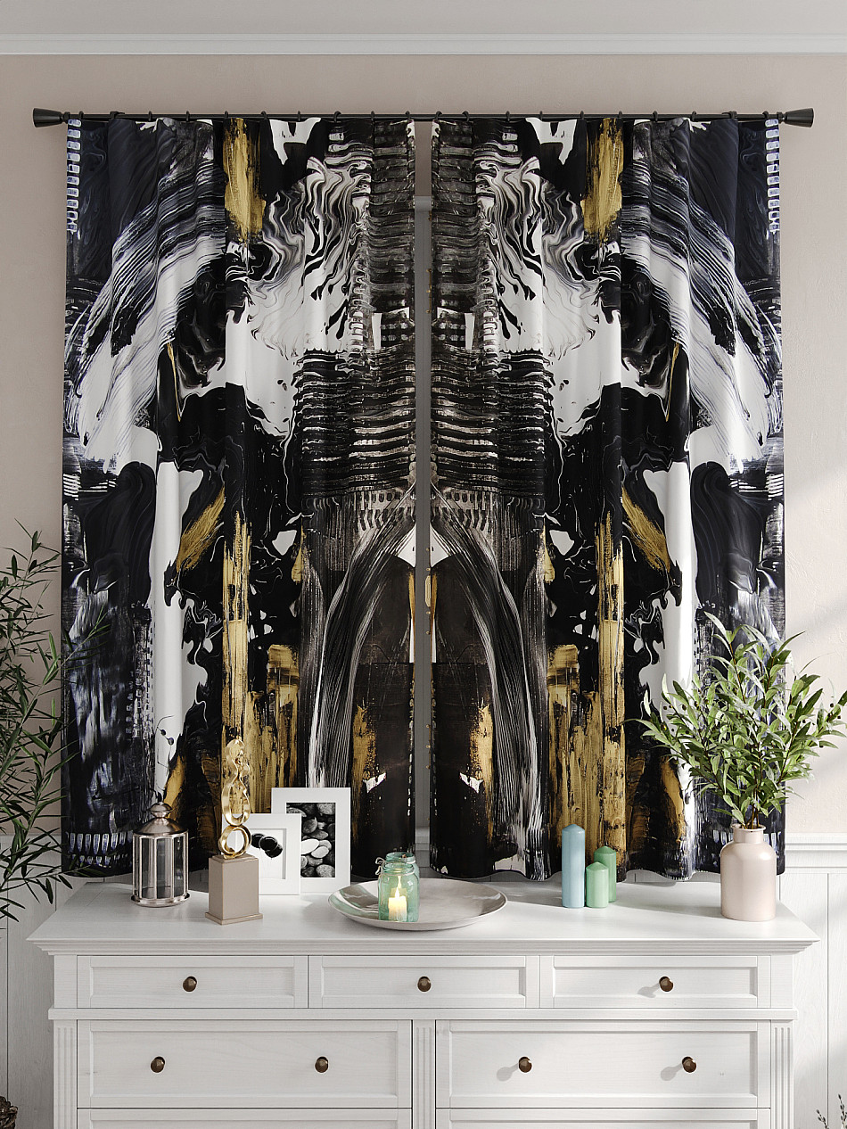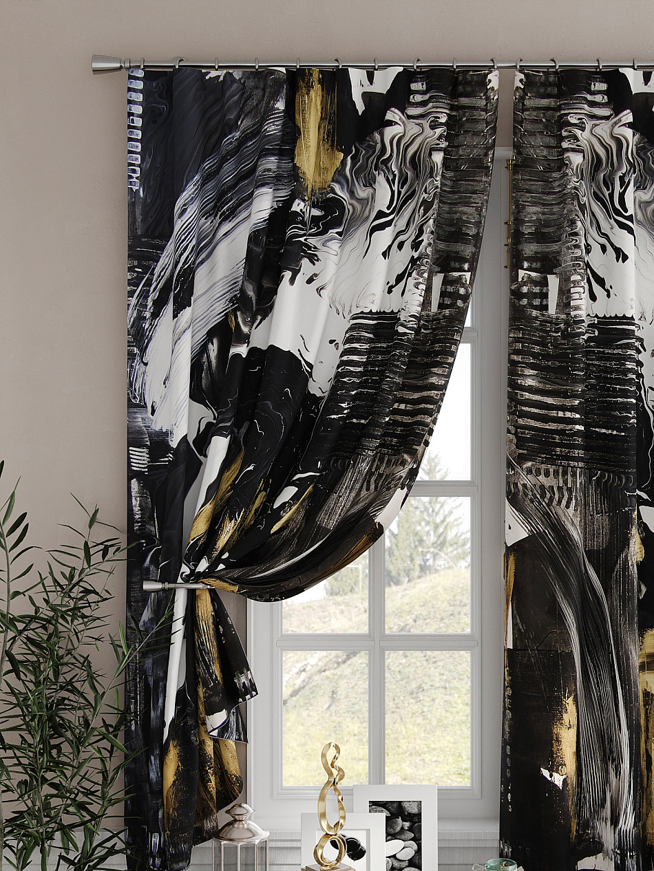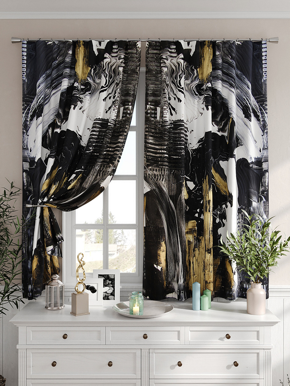 Портьеры 2 шт. Комплект штор из легкой портьерной ткани (габардин) оформлен печатным рисунком. Печатный рисунок дает широкие возможности обновить интерьер фактически не требуя ремонта за счет огромного выбора. Ткани с печатным рисунком безопасны и не содержат токсичных веществ. Не смотря на то, что материал легкий, он имеет высокую плотность, мало загрязнятся и не требует особого ухода даже после стирки, что важно для кухонных занавесок. Шторы не выцветают, не растягиваются, превосходно драпируются, образуя струящиеся складки. Прекрасное решение для создания красоты и уюта с помощью уникальных дизайнов.