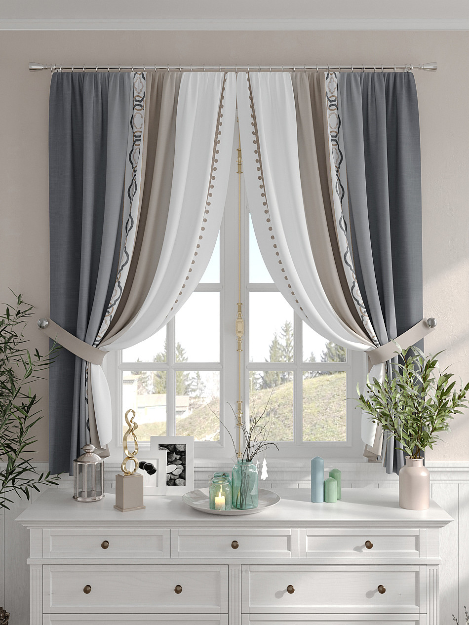 По верхнему краю портьер пришита шторная тесьма 6 см, с ее помощью затянув узелки от кордовых нитей с обеих сторон и стянув их до нужного размера можно сформировать округлые складки, далее вставить крючки в кармашки и повесить на карниз. Обязательно проверьте кордовые нити – они должны быть надежно завязаны, в противном случае во время стягивания они могут вылететь. Шторная тесьма имеет два ряда кармашков, с их помощью можно регулировать не только длину, но и ширину. Такое крепление подходит для всех типов карнизов.
