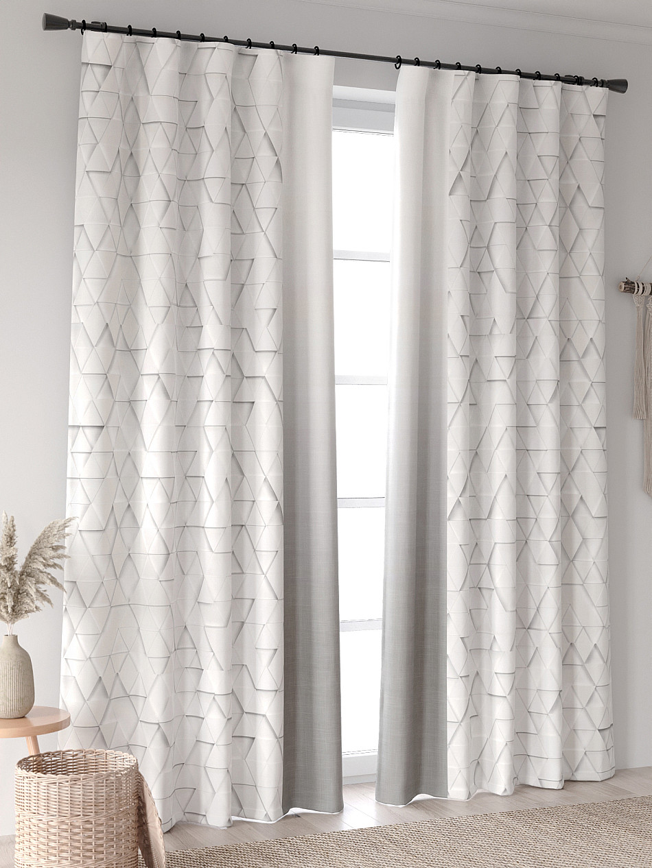 По верхнему краю портьеры пришита шторная тесьма 6 см, с ее помощью затянув узелки от кордовых нитей с обеих сторон и стянув их до нужного размера можно сформировать округлые складки, далее вставить крючки в кармашки и повесить на карниз. Обязательно проверьте кордовые нити – они должны быть надежно завязаны, в противном случае во время стягивания они могут вылететь. Шторная тесьма имеет два ряда кармашков, с их помощью можно регулировать не только длину, но и ширину. Такое крепление подходит для всех типов карнизов.