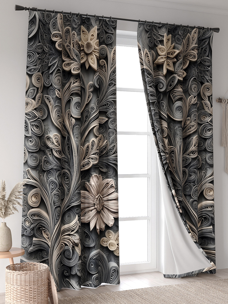 По верхнему краю портьеры пришита шторная тесьма 6 см, с ее помощью затянув узелки от кордовых нитей с обеих сторон и стянув их до нужного размера можно сформировать округлые складки, далее вставить крючки в кармашки и повесить на карниз. Обязательно проверьте кордовые нити – они должны быть надежно завязаны, в противном случае во время стягивания они могут вылететь. Шторная тесьма имеет два ряда кармашков, с их помощью можно регулировать не только длину, но и ширину. Такое крепление подходит для всех типов карнизов.