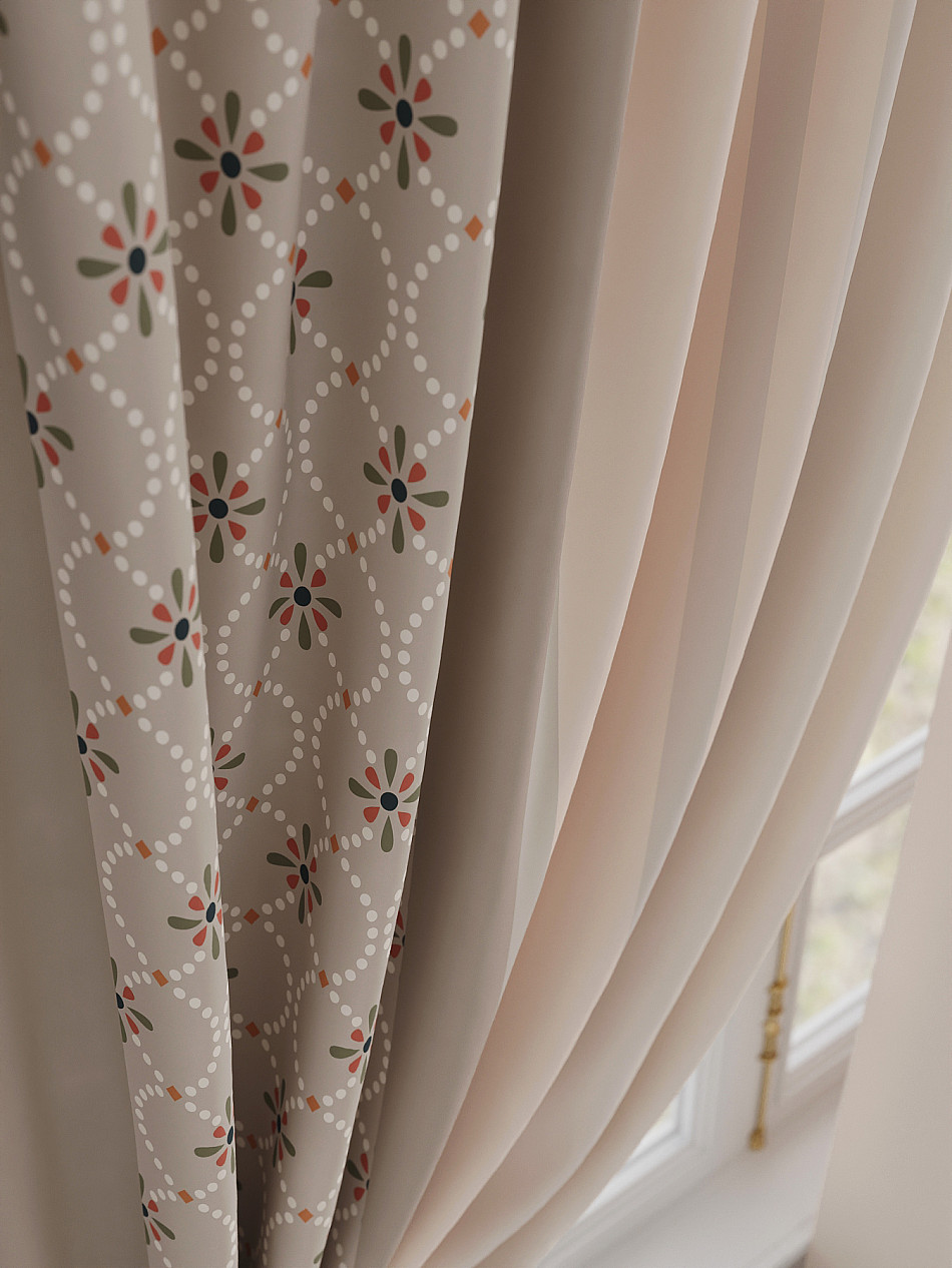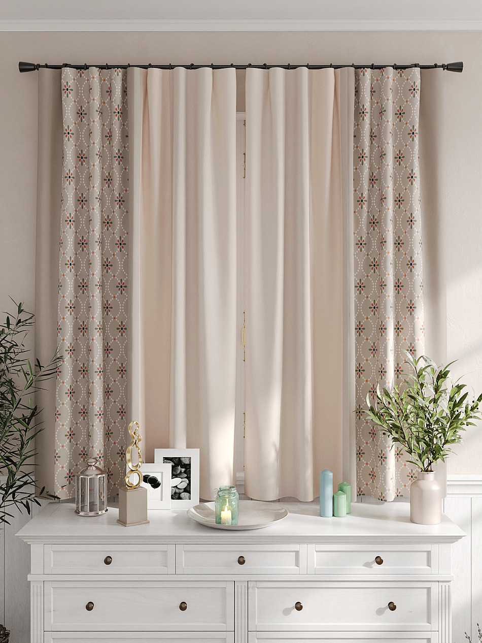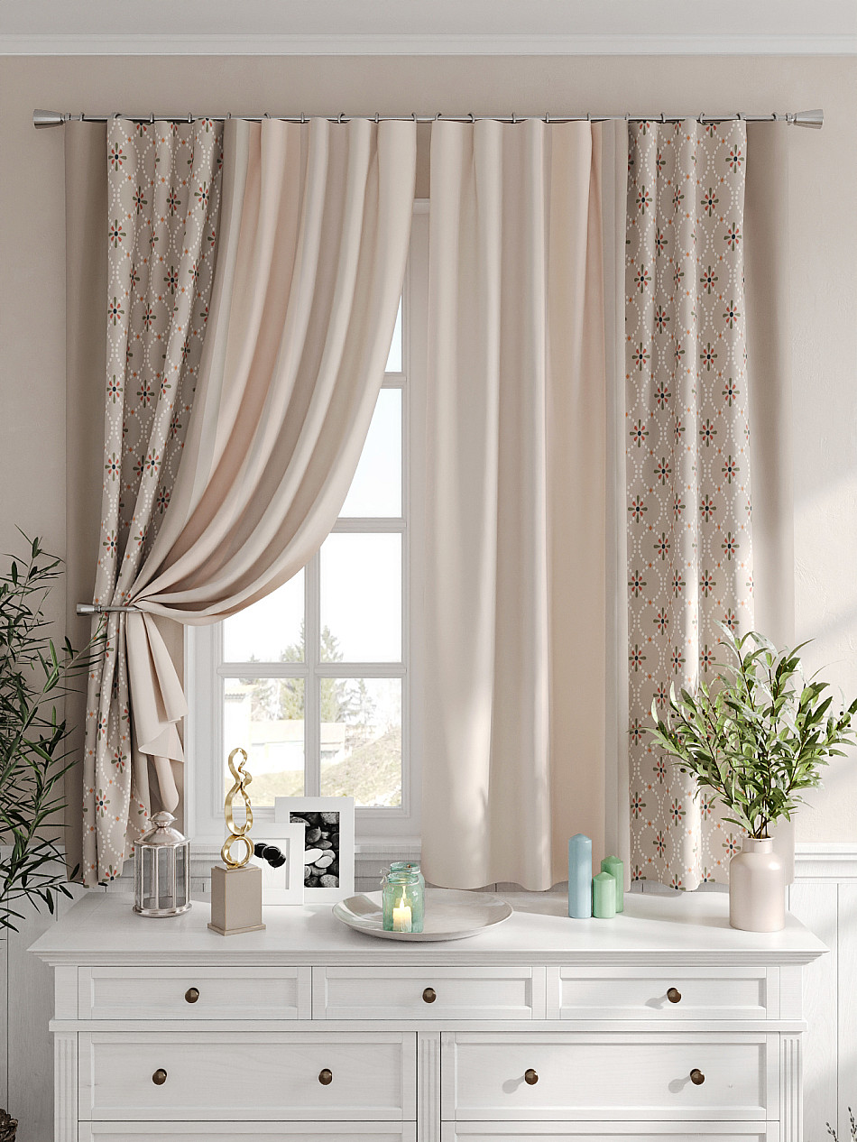 Портьеры 2 шт. Комплект штор из легкой портьерной ткани (габардин) оформлен печатным рисунком. Печатный рисунок дает широкие возможности обновить интерьер фактически не требуя ремонта за счет огромного выбора. Ткани с печатным рисунком безопасны и не содержат токсичных веществ. Не смотря на то, что материал легкий, он имеет высокую плотность, мало загрязнятся и не требует особого ухода даже после стирки, что важно для кухонных занавесок. Шторы не выцветают, не растягиваются, превосходно драпируются, образуя струящиеся складки. Прекрасное решение для создания красоты и уюта с помощью уникальных дизайнов.