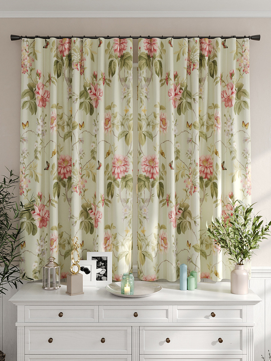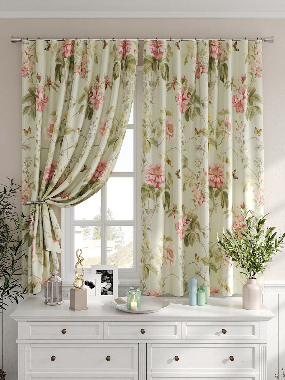 Портьеры 2 шт. Комплект штор из легкой портьерной ткани (габардин) оформлен печатным рисунком. Печатный рисунок дает широкие возможности обновить интерьер фактически не требуя ремонта за счет огромного выбора. Ткани с печатным рисунком безопасны и не содержат токсичных веществ. Не смотря на то, что материал легкий, он имеет высокую плотность, мало загрязнятся и не требует особого ухода даже после стирки, что важно для кухонных занавесок. Шторы не выцветают, не растягиваются, превосходно драпируются, образуя струящиеся складки. Прекрасное решение для создания красоты и уюта с помощью уникальных дизайнов.
