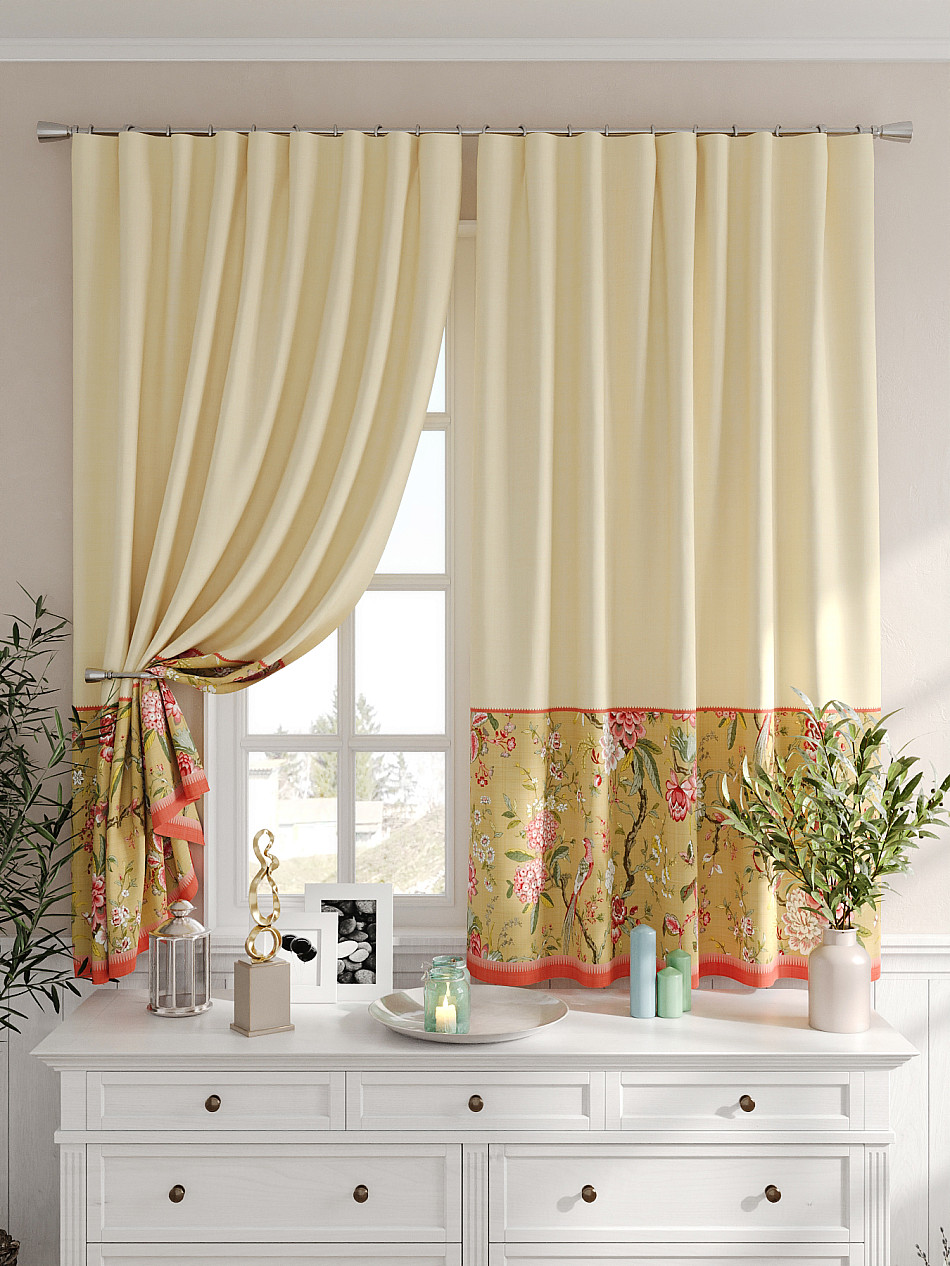 Портьеры 2 шт. Комплект штор из легкой портьерной ткани (габардин) оформлен печатным рисунком. Печатный рисунок дает широкие возможности обновить интерьер фактически не требуя ремонта за счет огромного выбора. Ткани с печатным рисунком безопасны и не содержат токсичных веществ. Не смотря на то, что материал легкий, он имеет высокую плотность, мало загрязнятся и не требует особого ухода даже после стирки, что важно для кухонных занавесок. Шторы не выцветают, не растягиваются, превосходно драпируются, образуя струящиеся складки. Прекрасное решение для создания красоты и уюта с помощью уникальных дизайнов.
