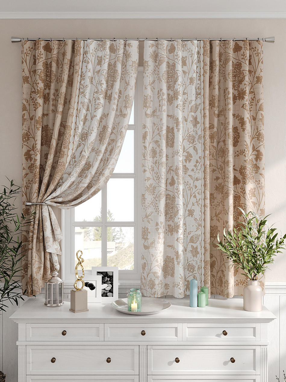 Портьеры 2 шт. Комплект штор из легкой портьерной ткани (габардин) оформлен печатным рисунком. Печатный рисунок дает широкие возможности обновить интерьер фактически не требуя ремонта за счет огромного выбора. Ткани с печатным рисунком безопасны и не содержат токсичных веществ. Не смотря на то, что материал легкий, он имеет высокую плотность, мало загрязнятся и не требует особого ухода даже после стирки, что важно для кухонных занавесок. Шторы не выцветают, не растягиваются, превосходно драпируются, образуя струящиеся складки. Прекрасное решение для создания красоты и уюта с помощью уникальных дизайнов.