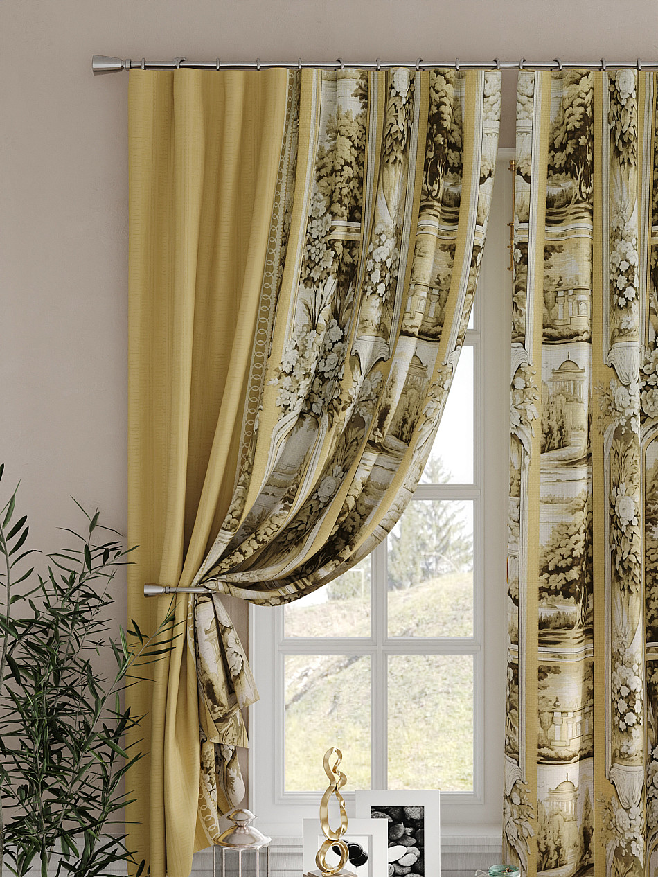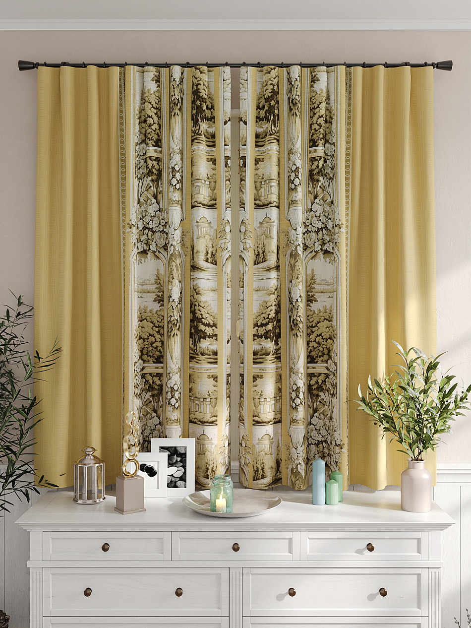 Портьеры 2 шт. Комплект штор из легкой портьерной ткани (габардин) оформлен печатным рисунком. Печатный рисунок дает широкие возможности обновить интерьер фактически не требуя ремонта за счет огромного выбора. Ткани с печатным рисунком безопасны и не содержат токсичных веществ. Не смотря на то, что материал легкий, он имеет высокую плотность, мало загрязнятся и не требует особого ухода даже после стирки, что важно для кухонных занавесок. Шторы не выцветают, не растягиваются, превосходно драпируются, образуя струящиеся складки. Прекрасное решение для создания красоты и уюта с помощью уникальных дизайнов.