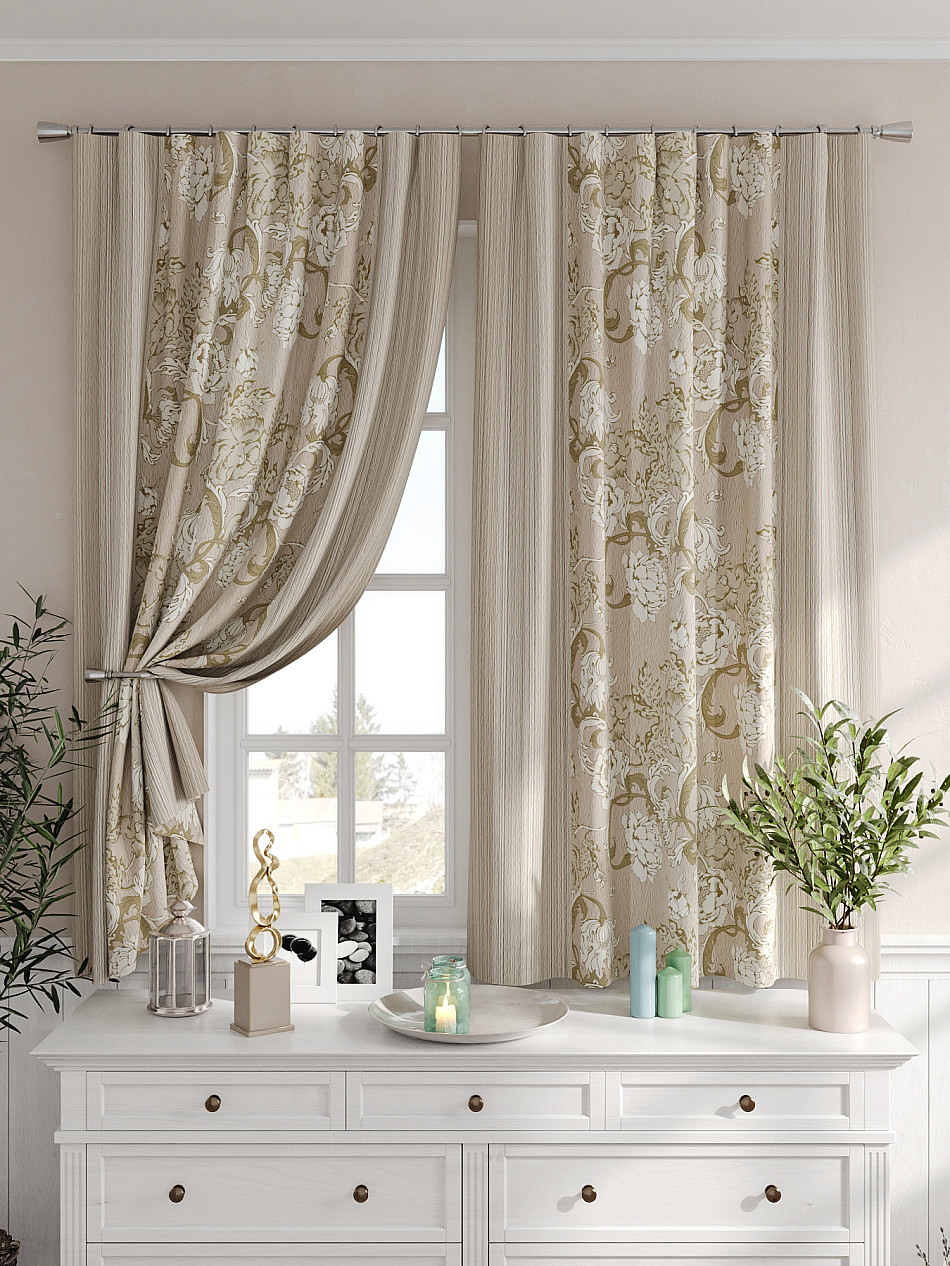 Портьеры 2 шт. Комплект штор из легкой портьерной ткани (габардин) оформлен печатным рисунком. Печатный рисунок дает широкие возможности обновить интерьер фактически не требуя ремонта за счет огромного выбора. Ткани с печатным рисунком безопасны и не содержат токсичных веществ. Не смотря на то, что материал легкий, он имеет высокую плотность, мало загрязнятся и не требует особого ухода даже после стирки, что важно для кухонных занавесок. Шторы не выцветают, не растягиваются, превосходно драпируются, образуя струящиеся складки. Прекрасное решение для создания красоты и уюта с помощью уникальных дизайнов.