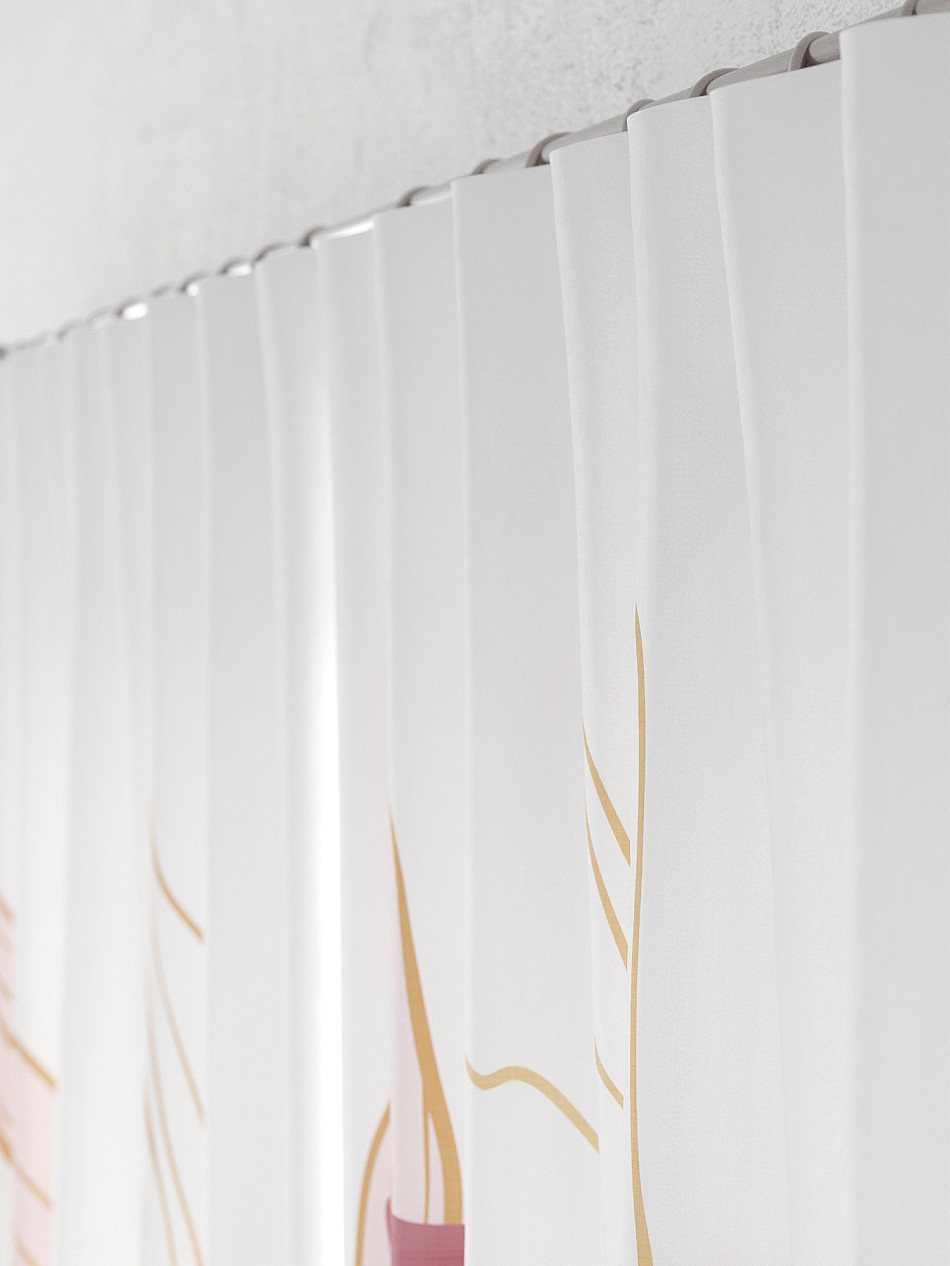 По верхнему краю портьер пришита шторная тесьма 6 см, с ее помощью затянув узелки от кордовых нитей с обеих сторон и стянув их до нужного размера можно сформировать округлые складки, далее вставить крючки в кармашки и повесить на карниз. Обязательно проверьте кордовые нити – они должны быть надежно завязаны, в противном случае во время стягивания они могут вылететь. Шторная тесьма имеет два ряда кармашков, с их помощью можно регулировать не только длину, но и ширину. Такое крепление подходит для всех типов карнизов.
